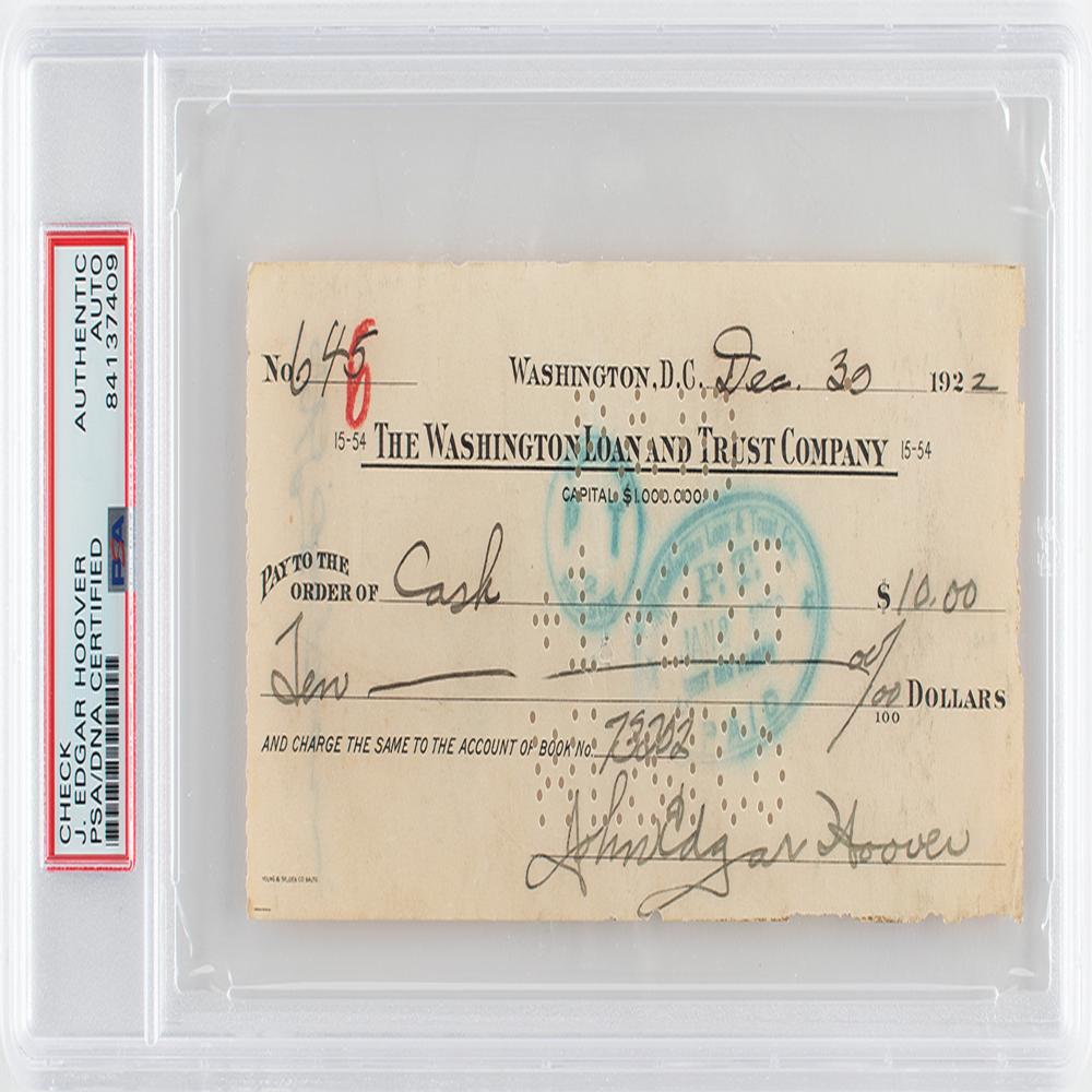The Washington Loan and Trust Company check, 6.75 x 2.75, filled out and signed by Hoover, "John Edgar Hoover," payable to Cash for $10, December 30, 1922. In fine condition. Encapsulated in a PSA/DNA authentication holder. Checks signed by Hoover remain exceedingly rare, with this being only the fourth we have offered.