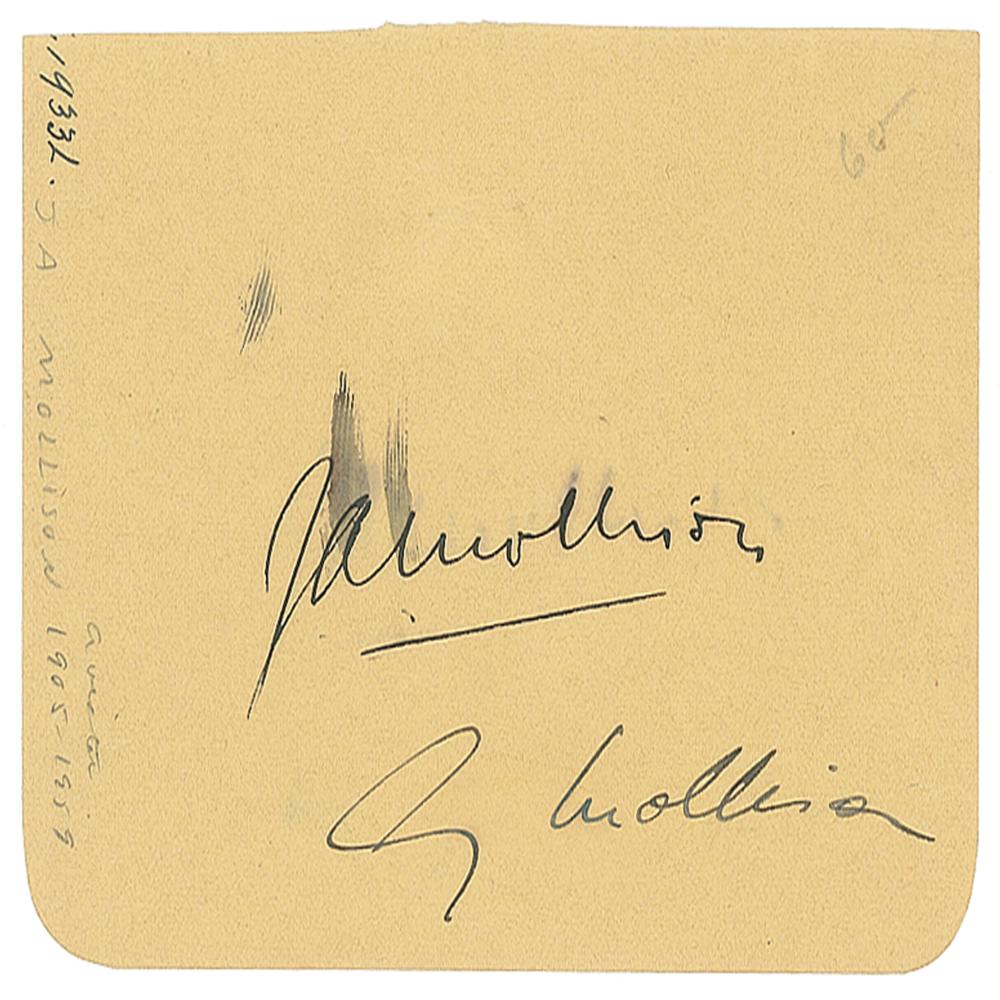Vintage fountain pen signatures of the flying couple, "J. A. Mollison" and "Amy Mollison,” on a yellow 4.25 x 3 album page. In fine condition, with brushing to Jim's signature. From the collection of Stephen Adamson.