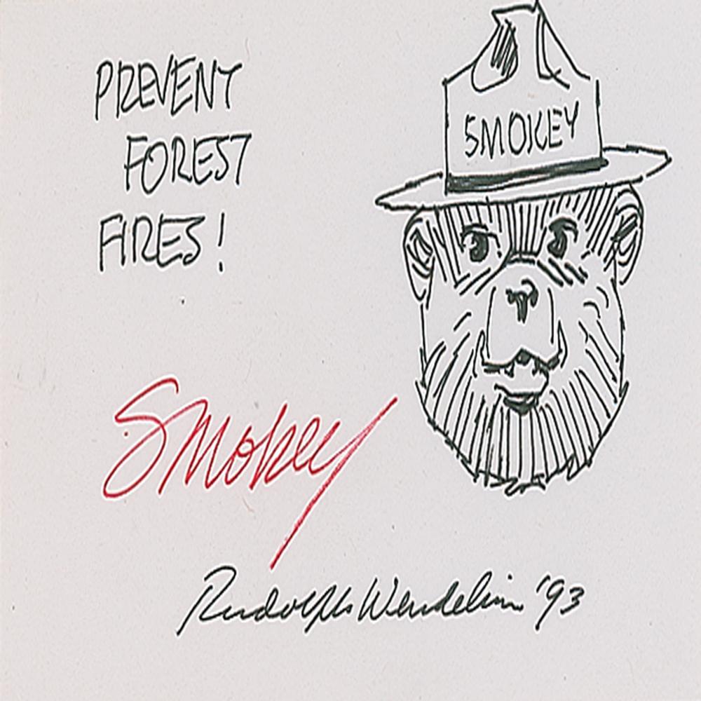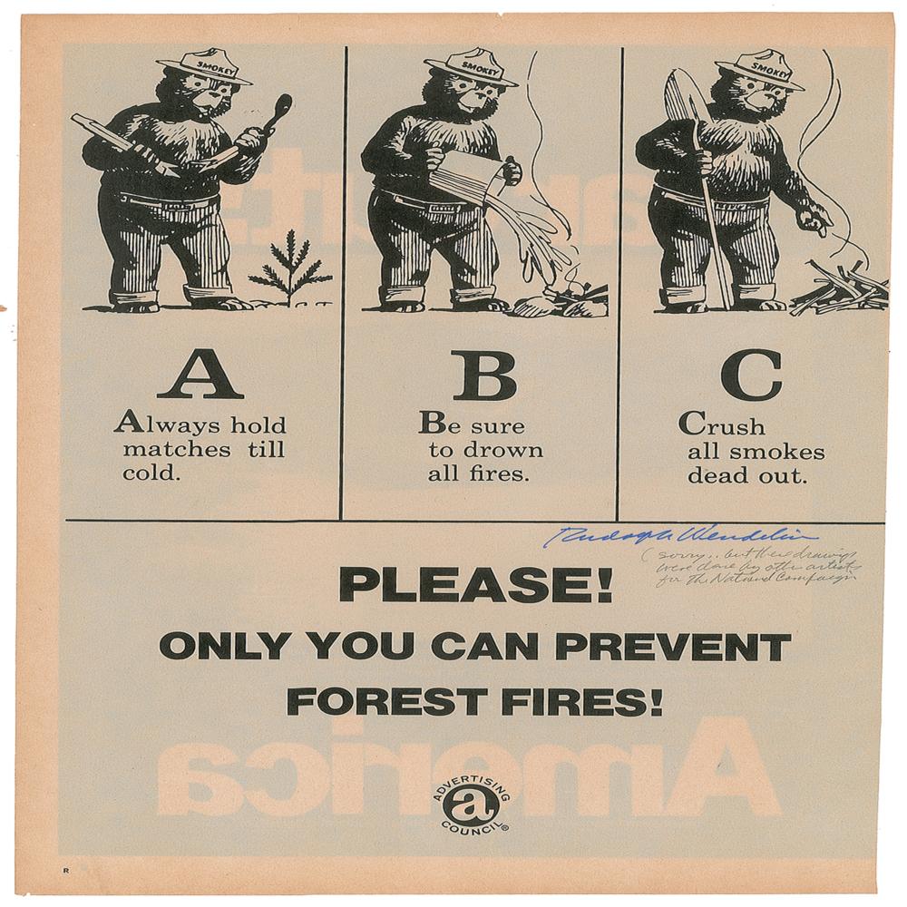 Two items: an original felt tip sketch of Smokey Bear on a white 5 x 3 card, signed, "Prevent Forest Fires! Smokey, Rudolph Wendelin, '93"; and a 10 x 13.25 page from a magazine featuring the 'ABCs' of forest fire prevention, signed in blue felt tip by Wendelin, who writes below: "Sorry? but the drawings were done by other artists for the National Campaign." In fine condition. From the collection of Stephen Adamson.