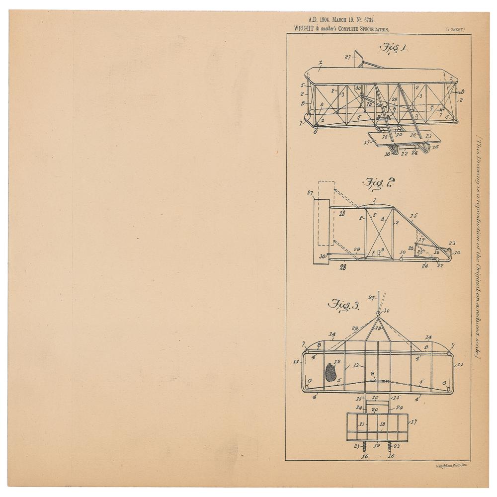 Original British linen-backed patent lithograph for the Wright Brothers' improvement in aeronautical machines, one page, 14.25 x 10, March 19, 1904. The diagram features three views of the Wright flyer with 'wing warping' mechanism for maintaining stability in flight. The top border reads: "A.D. 1904. March 19. No. 6732. Wright & Another's Complete Specification." The lower borders feature the printed text: "Malby & Sons, Photo-Litho." The right border reads: "This Drawing is a reproduction of the Original on a reduced scale." In fine condition.
