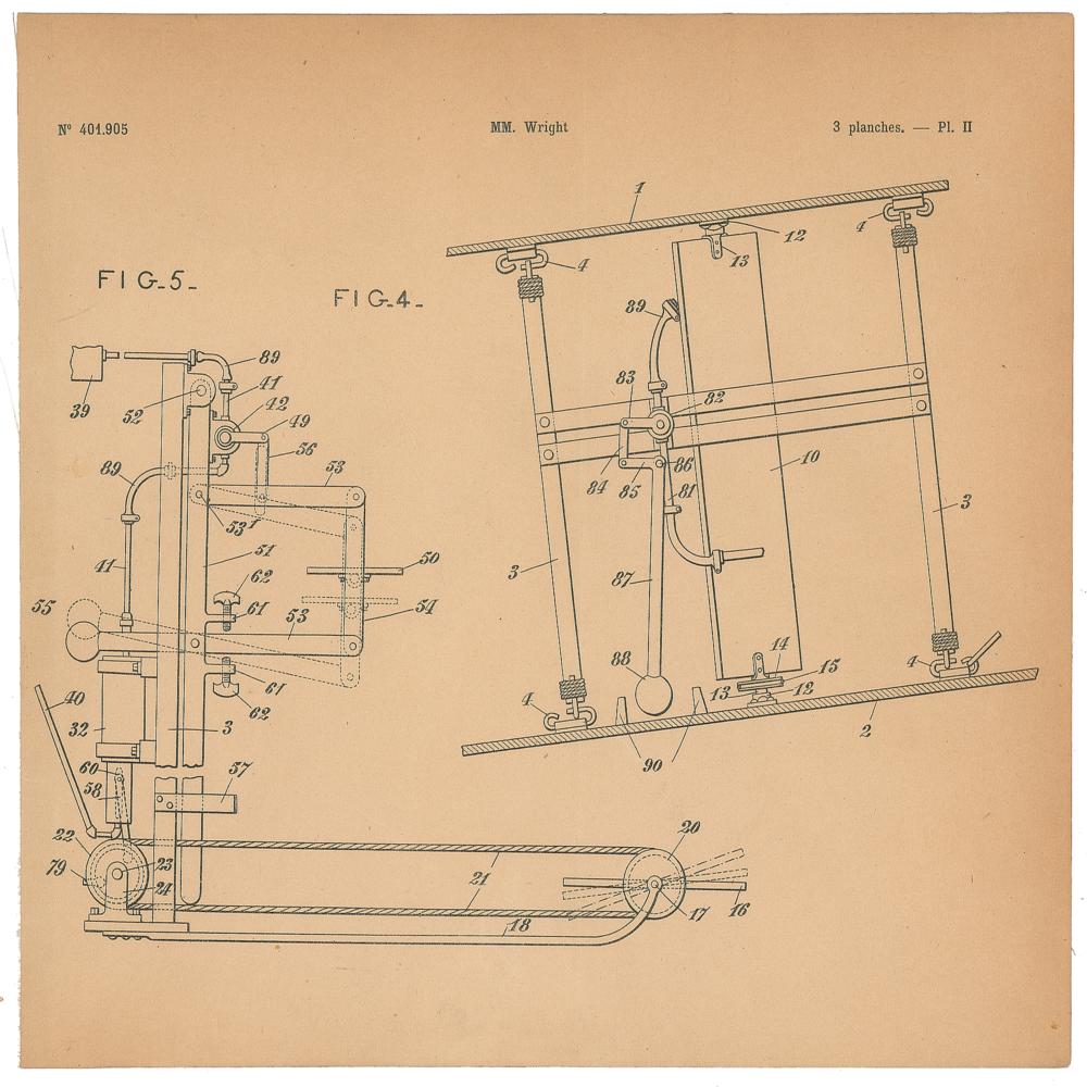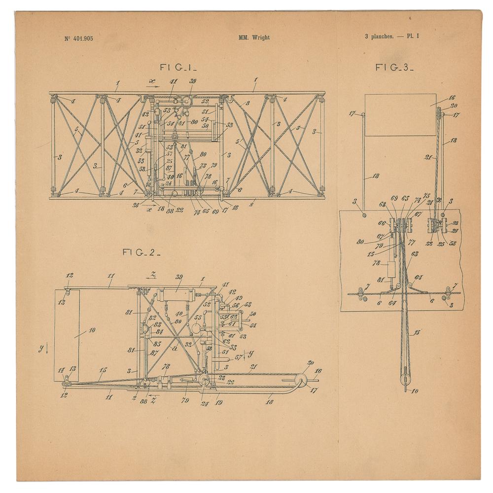 Original French linen-backed patent lithograph for the Wright Brothers' improvement in flying machines, one page, 12 x 10.5, circa 1909. The diagram features three views of the Wright flyer with a mechanism for automatic stabilization of the aircraft. The top border reads: "No. 401.905, MM. Wright, 3 planches—Pl. I." In fine condition.