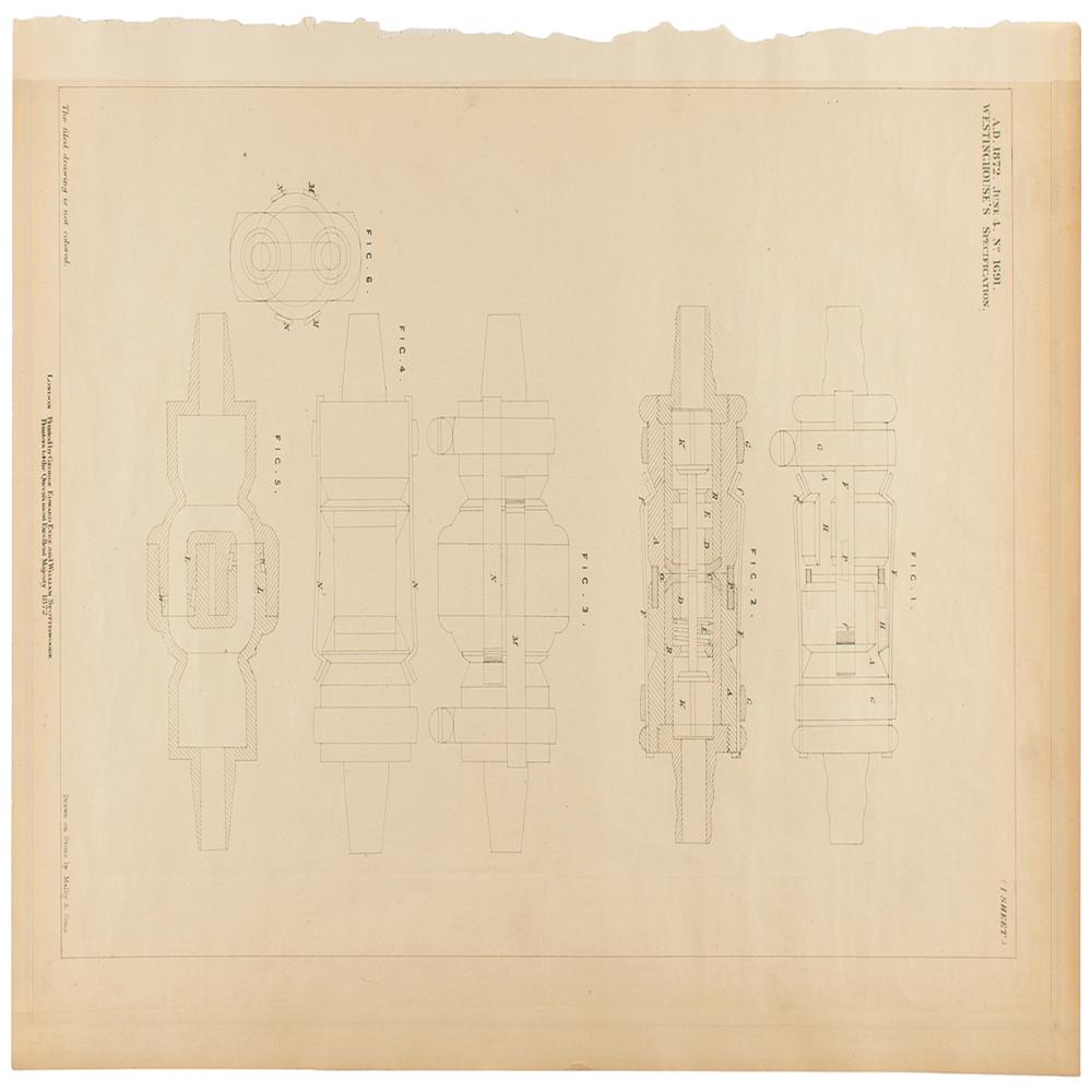 Impressive original British linen-backed patent lithograph for George Westinghouse's 'improvements in apparatus for working brakes and communicating signals on railway trains by compressed air,' one page, 14.5 x 21, June 4, 1872. The diagram features several figures depicting the improved coupling apparatus for Westinghouse's famous air brake. The top border reads: "A.D. 1872. June 4. No. 1691. Westinghouse's Specification." The lower border reads: "The filed drawing is not colored. Drawn on stone by Malby & Sons. London, Printed by George Edward Eyre and William Spottiswoode, Printers to the Queen's most Excellent Majesty, 1872." In fine condition.