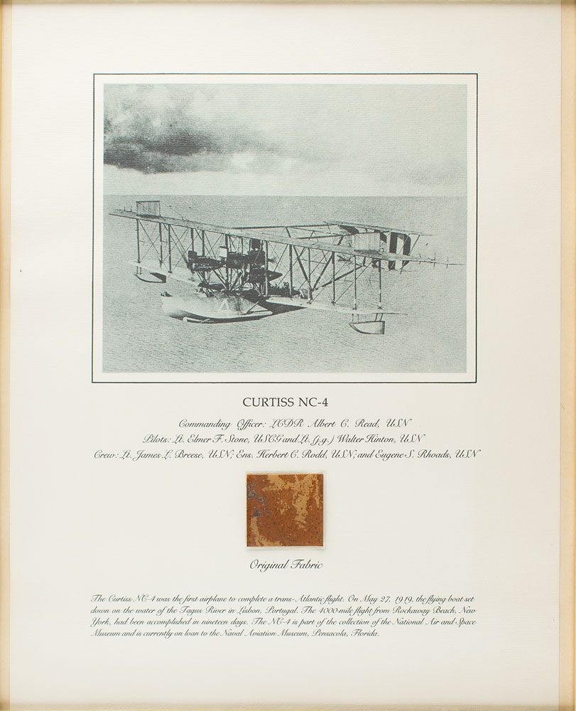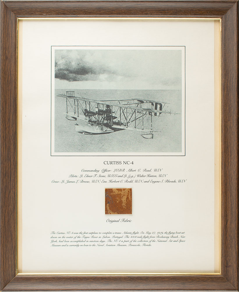 Flown fabric presentation created by the Smithsonian Institution, featuring an affixed dark brown 2 x 2 swatch of wing fabric removed from the Curtiss NC-4 Flying Boat that made the first transatlantic flight from Rockaway Beach, New York, to Lisbon, Portugal, in 1919. Framed to an overall size of 18.5 x 22.5. In fine condition. In the 1970s-80s, the Smithsonian Institution National Air and Space Museum created a series of relic presentations using fabric removed during the restoration of historically important aircraft. A desirable piece from a historic aircraft. It seems remarkable that the Smithsonian would sell off such significant artifacts, and after a few years, not surprisingly, the museum decided that this was not a good idea after all and their policy now forbids this practice.
