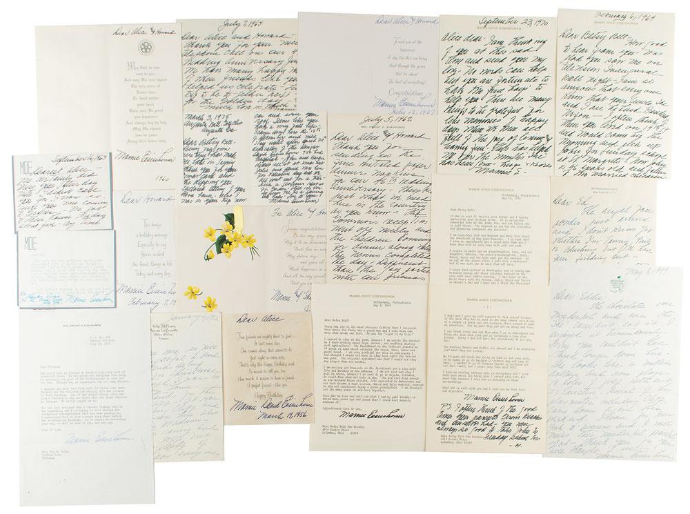Large and impressive collection of 31 items signed by Mamie Doud Eisenhower, including letters, cards, and a signed photograph, dated from 1949 to 1973. Includes sixteen TLSs, eight ALSs, seven signed birthday/greeting cards (two with lengthy handwritten notes inside). Recipients include Alice and Howard Snyder (physician to the president and his wife), Betsy Bell Van Voorhis, Edward D. Lane, and Mrs. Roy H. Coles. Mamie exchanges pleasantries, sends thanks for gifts, and expresses her support for Richard Nixon. A sampling of the content: