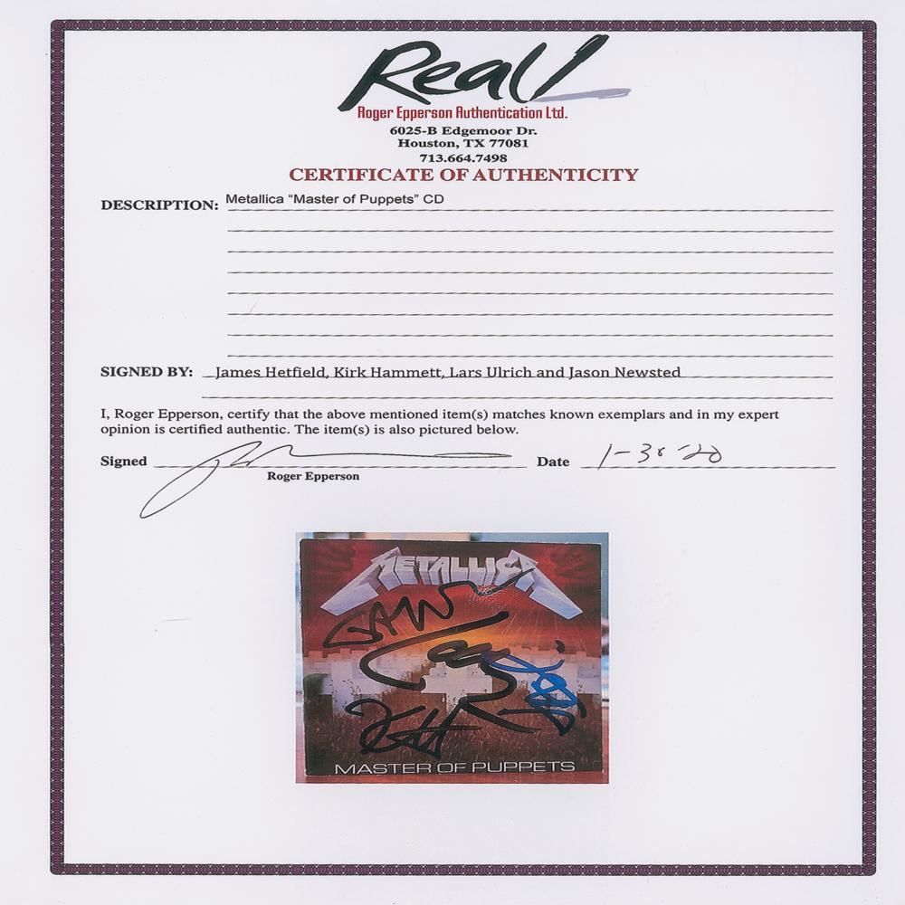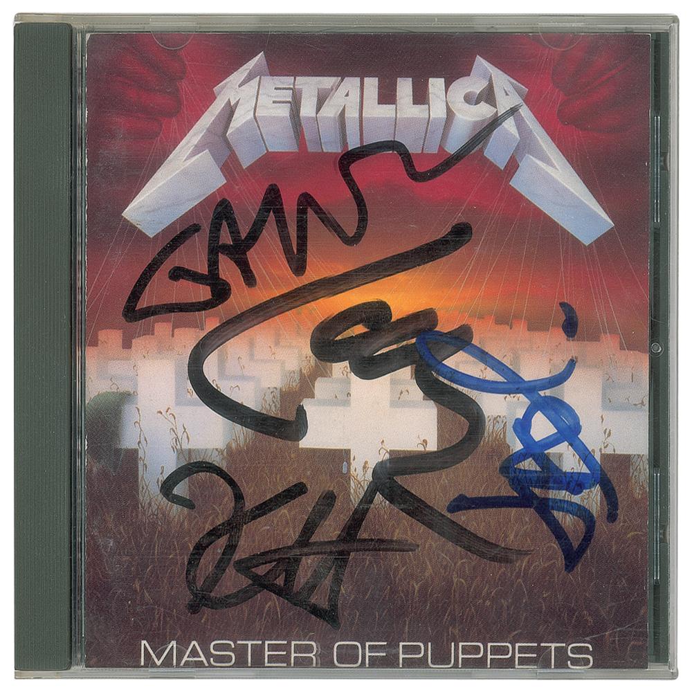 Master of Puppets CD by Metallica, signed on the front of the booklet in blue and black felt tip by James Hetfield, Kirk Hammett, Jason Newsted, and Lars Ulrich. In fine condition. The CD is included. Accompanied by a full letter of authenticity from REAL.