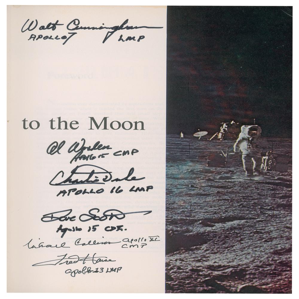 Signed book: Apollo Expeditions to the Moon. First edition. Washington, D.C.: NASA, 1975. Hardcover, 9.25 x 12, 313 pages. Signed on the title page in black felt tip by six Apollo astronauts—"Walt Cunningham, Apollo 7 LMP," "Al Worden, Apollo 15 CMP," "Charlie Duke, Apollo 16 LMP," "Dave Scott, Apollo 15 CDR.," "Michael Collins, Apollo XI CMP," and "Fred Haise, Apollo 13 LMP." In very good to fine condition, with scuffing to the covers, and sunning to the spine.
