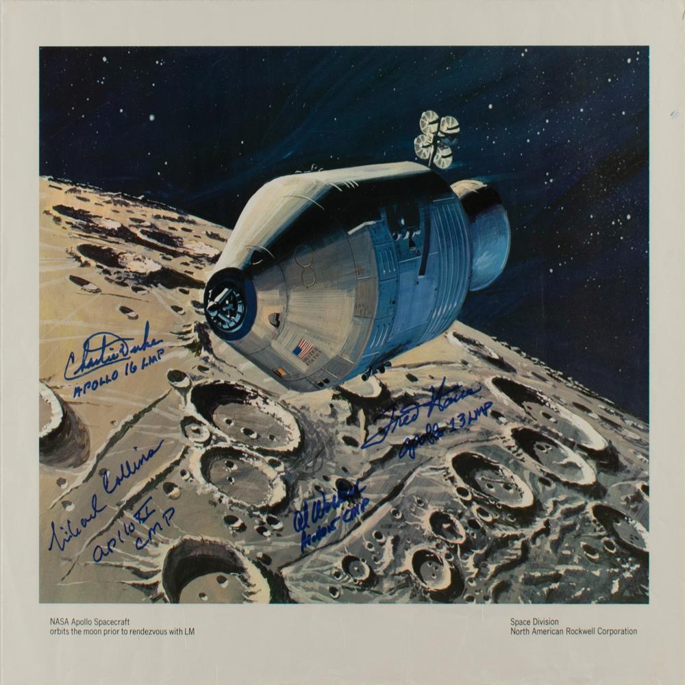 Desirable color 15 x 12.25 print from the Space Division at North American Rockwell, which features an artistic depiction of a lunar-orbiting Apollo Command Module, with caption to lower left reading: "NASA Apollo Spacecraft orbits the moon prior to rendezvous with LM." The print is signed in blue felt tip by four Apollo astronauts: "Michael Collins, Apollo XI CMP," "Fred Haise, Apollo 13 LMP," "Al Worden, Apollo 15 CMP," and "Charlie Duke, Apollo 16 LMP." In very good to fine condition, with creasing in the bottom border.