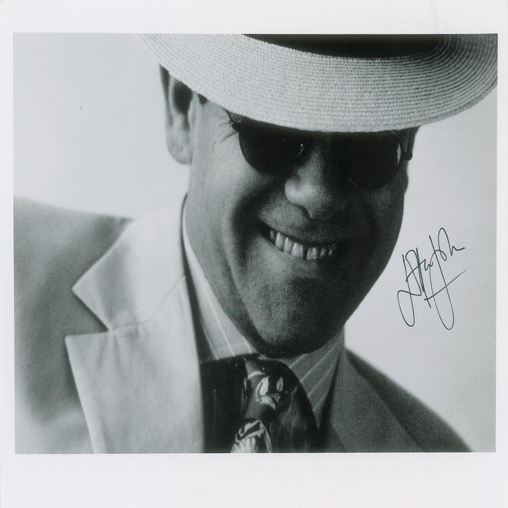Glossy 10.25 x 8 photo of Elton John smiling from under the brim of his hat, signed neatly in black felt tip. In fine condition.