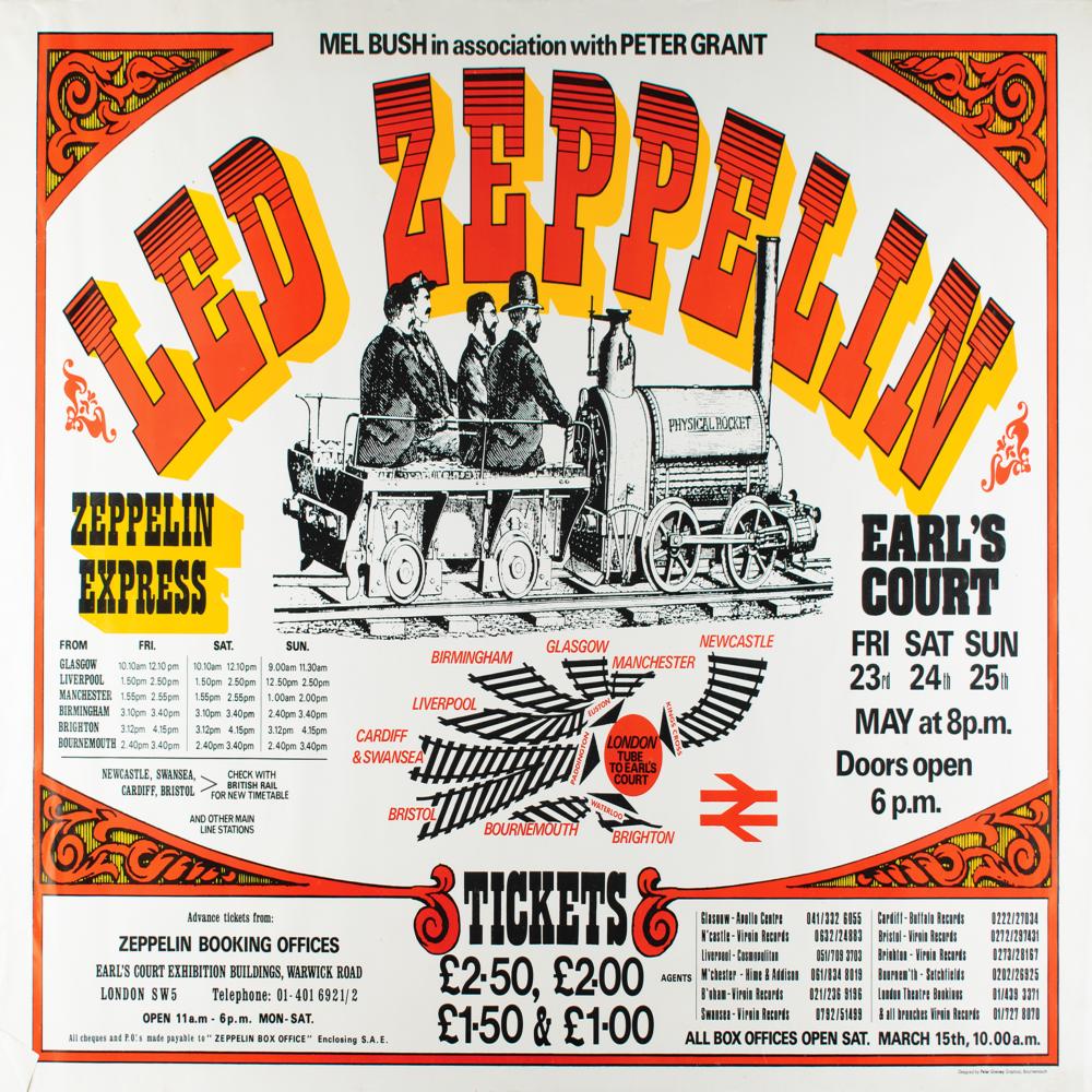 In celebration of the release of their sixth album, Physical Graffiti, Led Zeppelin arranged a five-night residency at Earls Court from May 17-25, 1975, with the first two shows added due to unprecedented public demand. These were the only Led Zeppelin concerts in the country in this year, and so the events sold out their entire run of 85,000 tickets. To help promote the concerts, promoter Mel Bush and manager Peter Grant used advertisements which displayed a train, dubbed the 'Zeppelin Express,' linked to Earls Court via the Inter City train services of British Rail.