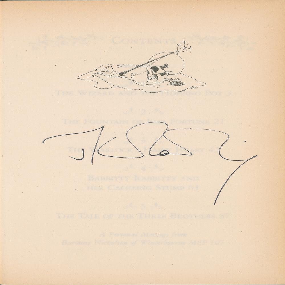 Signed book: The Tales of Beedle the Bard. First edition. London: Children's High Level Group, 2008. Hardcover, 5 x 7.25, 108 pages. Signed on a prefatory page in black felt tip by J. K. Rowling. In fine condition, with light toning to textblock edges, three price stickers to rear board, and a Rowling authentication hologram affixed to the copyright page. Accompanied by a full letter of authenticity from Beckett Authentication Services.