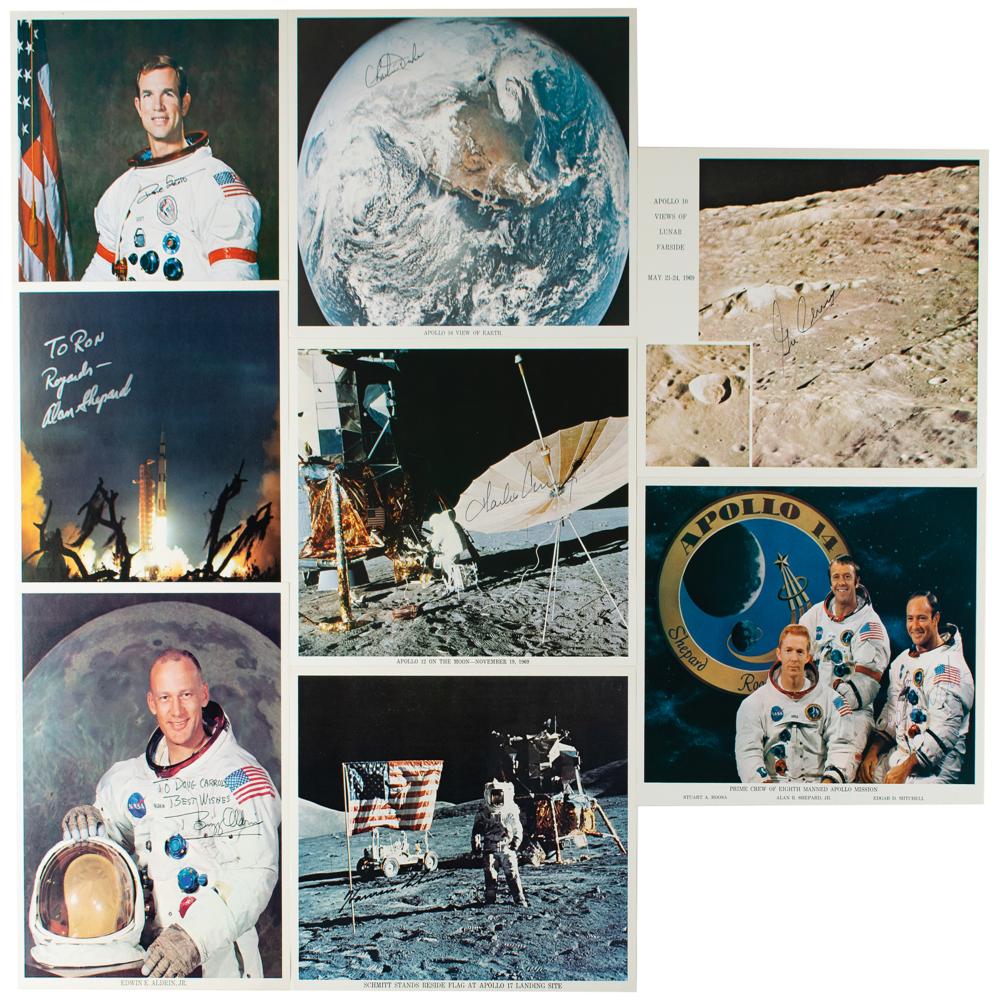 Eight official color NASA lithographs, 8 x 10 and 10 x 8, each signed in ink by a moonwalker, including: Buzz Aldrin (ins), Dave Scott, Ed Mitchell, Gene Cernan, Charles Conrad, Harrison Schmitt, Charlie Duke, and Alan Shepard (ins). In overall very fine condition.