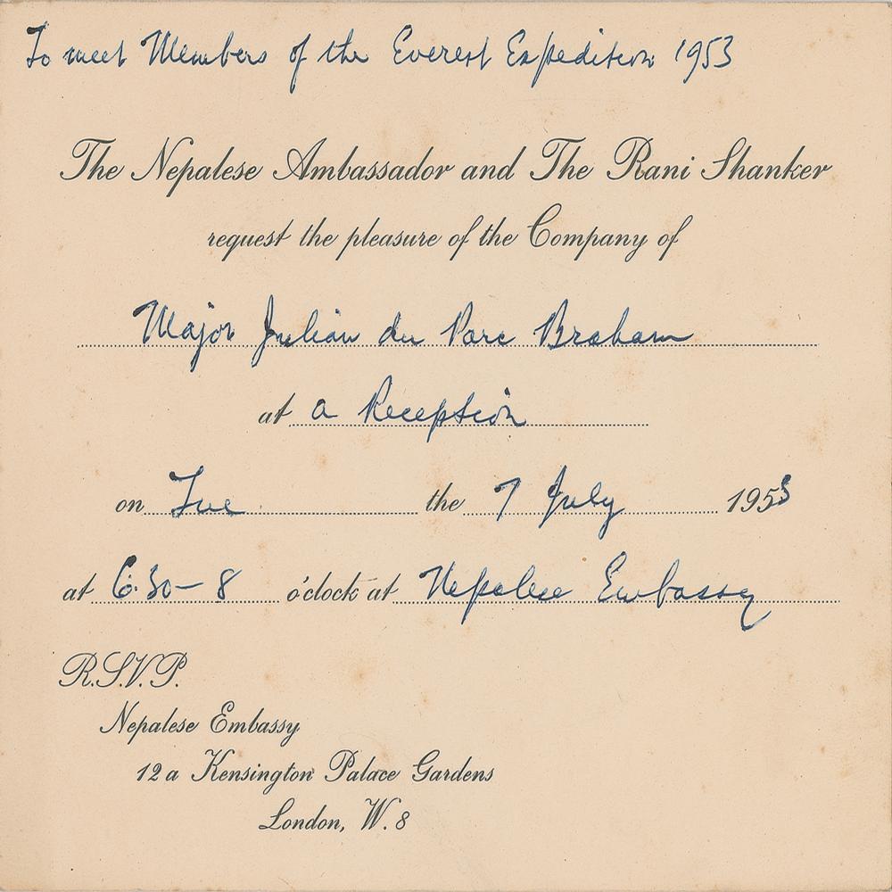 Vintage fountain pen signatures of Edmund Hillary, Tenzing Norgay, and Charles Wylie on the reverse of a 7 x 5 invitation for a meeting with the members of the 1953 Everest Expedition at the Nepalese Embassy in London. In fine condition.