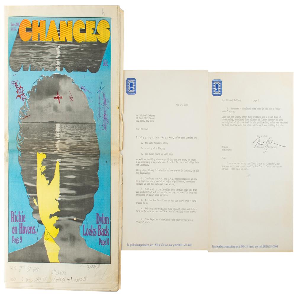 TLS signed “Michael Goldstein,” two pages, 8.5 x 11, Goldstein Organization letterhead, May 14, 1969. Letter from Michael F. Goldstein, Jimi Hendrix’s publicist, to Hendrix’s manager Michael Jeffrey, detailing his recent activities, primarily manipulating the press responses to Hendrix’s drug bust in Toronto for possession of hashish and heroin. In part: "To bring you up to date. As you know, we've been working on: 1. The Life Magazine story, 2. a story with Playboy, 3. pop music round-up with look, as well as handling advance publicity for the tour, on which I am enclosing a separate memo from Rod Jacobson and clips from Pat Costello. Along other lines, in relation to the events in Toronto, we did the following: 1. Convinced the A.P. and U.P.I. representatives in New York that the story was of no major significance, therefore keeping it off national news wires; 2. Indicated to the Canadian News Service that the drug was unidentified and not heroin, so that no specific drug was mentioned by their news service; 3. Got the New York Times to cut the story from 4 paragraphs to 1; 4. Had long conversations with Rolling Stone and Richie York in Toronto on the ramifications of Rolling Stone story; 5. Time Magazine—convinced them that it was not a 'People' story; 6. Newsweek—convinced them that it was not a 'Newsmaker' story; Last but not least, after much prodding and a great deal of threatening, convinced John Wilcock of 'Other Scenes' to send me original of picture used in his publication, which was returned to Jimi Hendrix with the other pictures I was holding for him?P.S. I am also enclosing the first issue of 'Changes,' the new pop music paper published in New York. Check the center spread—now pull it out." Includes the copy of Changes mentioned, which has a portrait of Hendrix's chest and necklaces as the center spread. In fine condition.