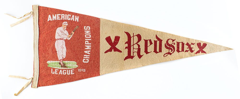 Gorgeous original vintage felt pennant from the 1915 Boston Red Sox season, honoring their success as American League champions. The oversized pennant measures 35″ long and 14.5″ tall, and features am image of a batter with "Red Sox" on his uniform on a red felt background, with white text: "American League Champions, 1915." The team name, "Red Sox," is displayed in bold red lettering on a white background, flanked by two sets of crossed red stockings. Complete with its rare tassels along the left edge. In very good to fine condition, with light soiling and minor wear to some of the text.