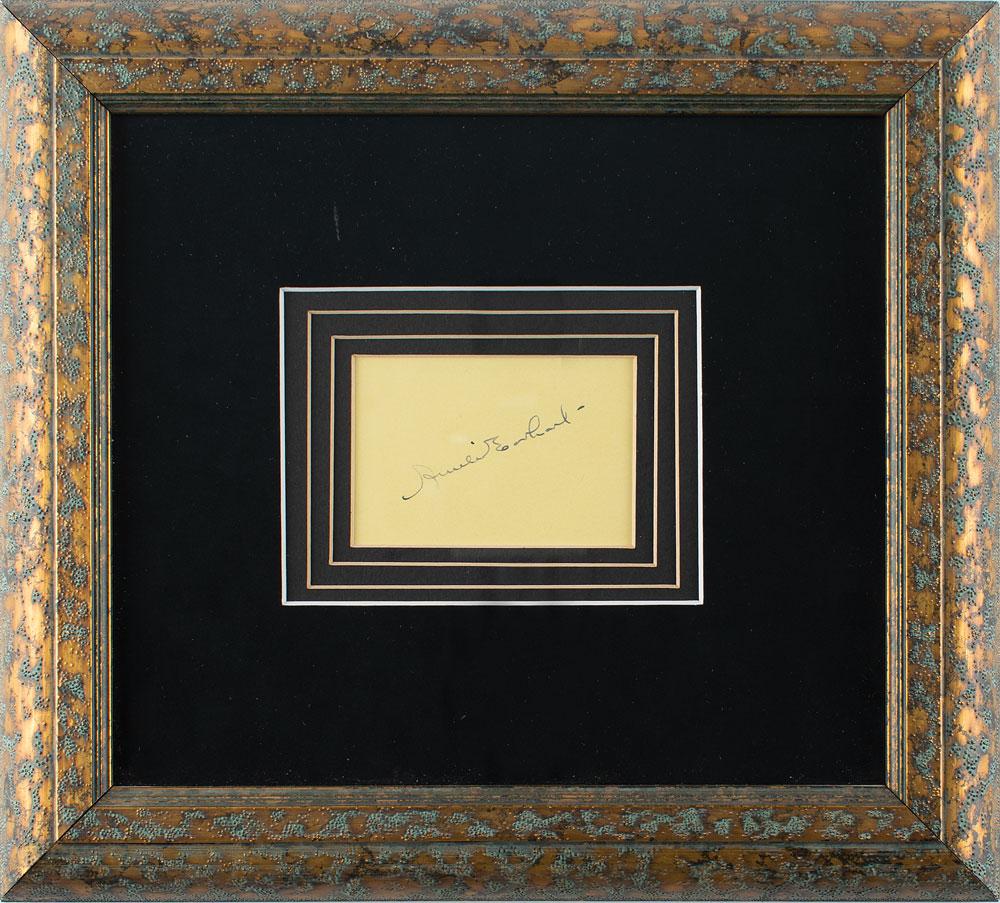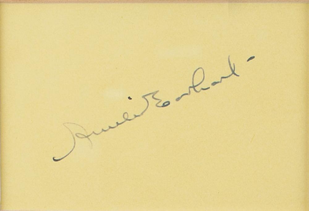 Beautiful vintage fountain pen signature, "Amelia Earhart,” on a light yellow 3.25 x 2.25 sheet. Archivally matted and framed to an overall size of 11.75 x 10.5. In fine condition.