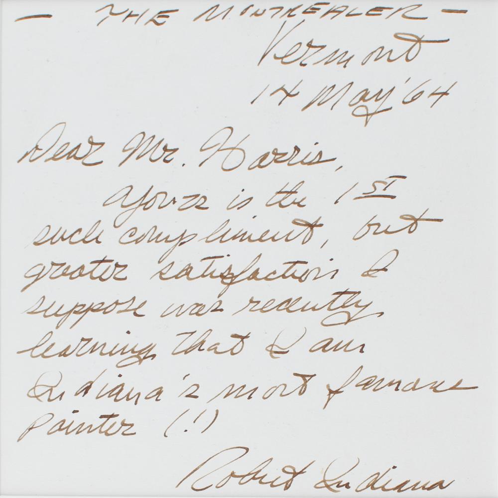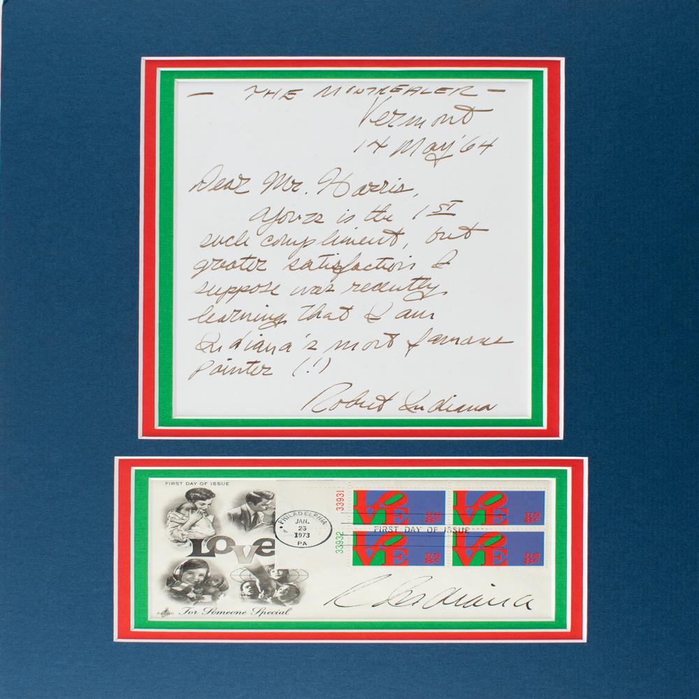 Two items: an ALS, one page, 5.5 x 8, May 14, 1964. Letter to Mr. Harris, in full: "Yours is the 1st compliment, but greater satisfaction I suppose was recently learning that I am Indiana's most famous painter"; and an FDC with a love-themed cachet and a block of four Indiana 'Love' stamps, signed below in fountain pen, "R. Indiana." Both are triple-matted together to an overall size of 11 x 17. In overall fine condition.