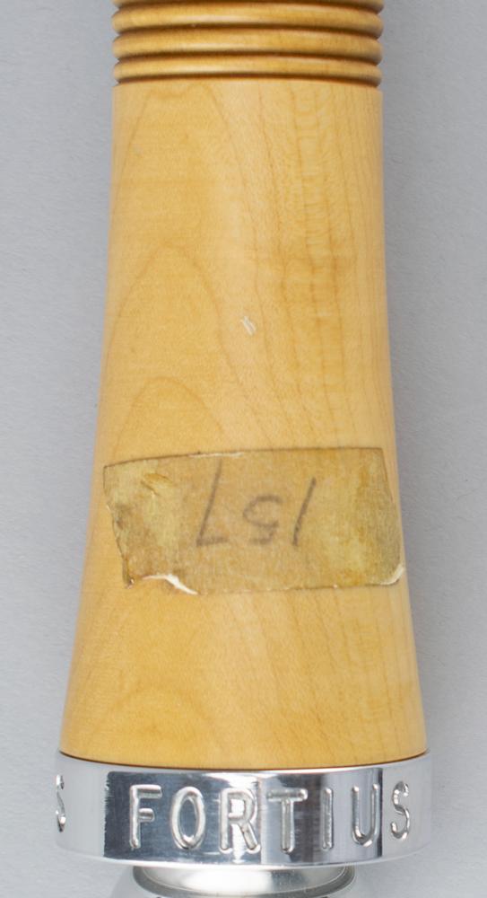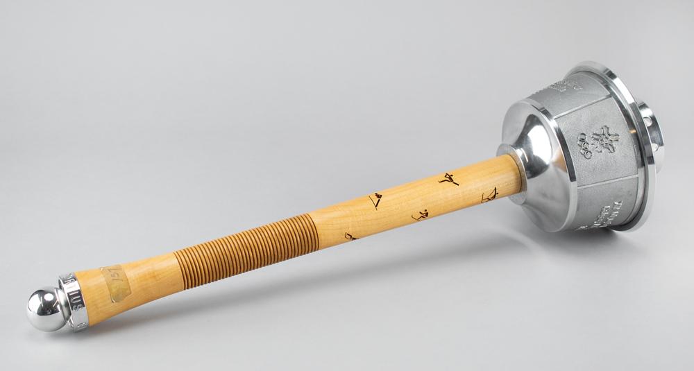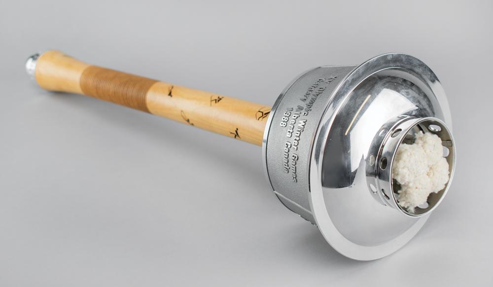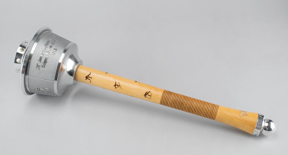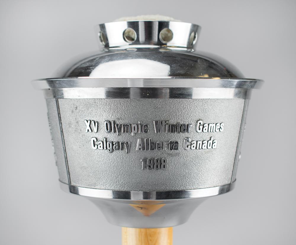 Very desirable official 1988 Calgary Winter Olympics torch used during the Olympic relay, comprised of aluminum with a maple handle, measuring 23.5? in length, emblazoned on the handle with pictograms of ten Winter Olympic sports; tape to lower portion of handle marked "157." The top inscribed with raised text in English and French, ?XV Olympic Winter Games Calgary Alberta Canada 1988,? with underside of bowl engraved: ?COA/A.O.C. 1979-1986?; the ball at the base of the handle is engraved with the Olympic motto, ?Citius, Altius, Fortius.? Complete with its unlit wick.