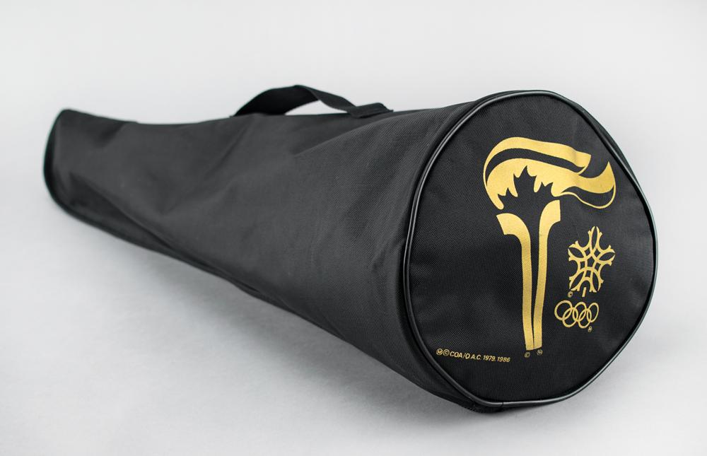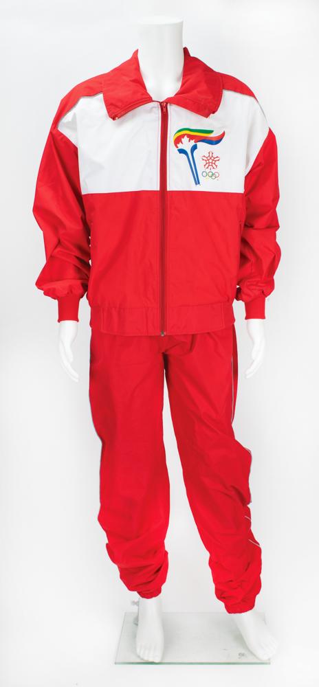 Includes the original black carrying bag and a highly appealing official torchbearer relay suit of the Calgary Games by Sun Ice of Canada, which consists of red and white zip-up jacket, size large, with brightly colored Calgary and torch relay logos to left chest and back area, and a pair of red track pants, size 38, with elastic waistband; custom labels to inner collar and waist area are marked "2010.14.16" and "2010.14/.17."