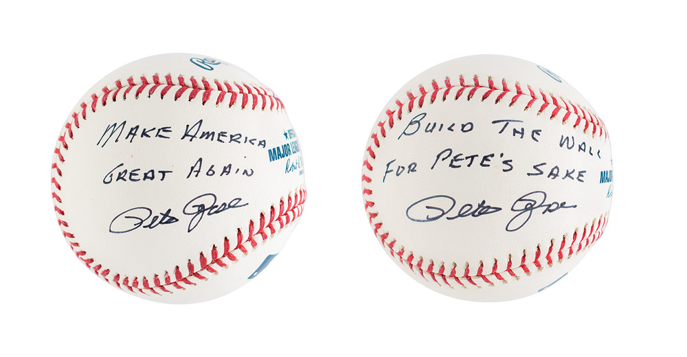Two official Rawlings Major League (Manfred) baseballs, signed on the side panels in black felt tip with political slogans: "Make America Great Again, Pete Rose" and "Build the Wall for Pete's Sake, Pete Rose." In overall very fine condition.