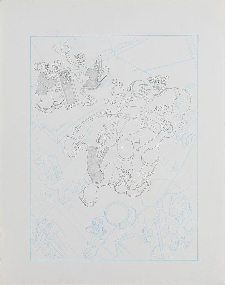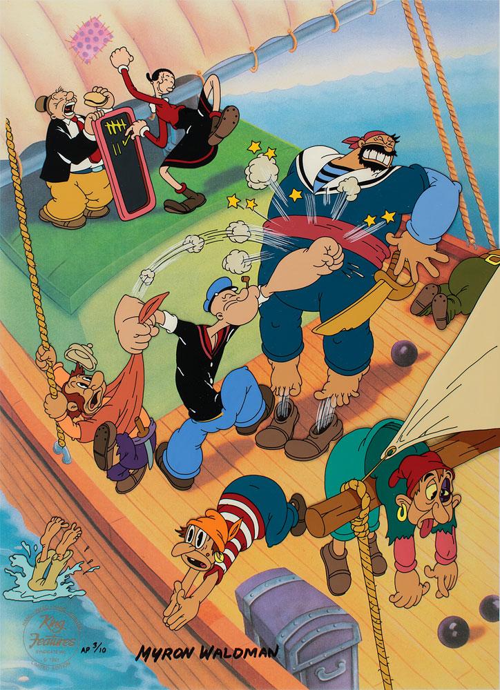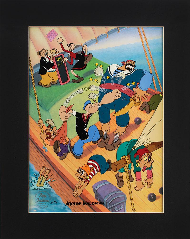 (King Features, 1991) Limited edition hand-painted Popeye animation cel entitled 'Mutiny,' numbered AP 3/10, signed at the bottom in black felt tip by Myron Waldman. Includes the original master drawing, accomplished in graphite and colored pencil on an off-white 11 x 14 sheet. The cel is matted to an overall size of 16 x 20. In fine condition.