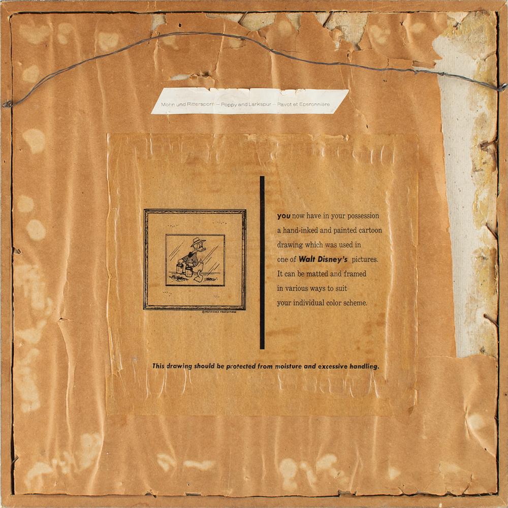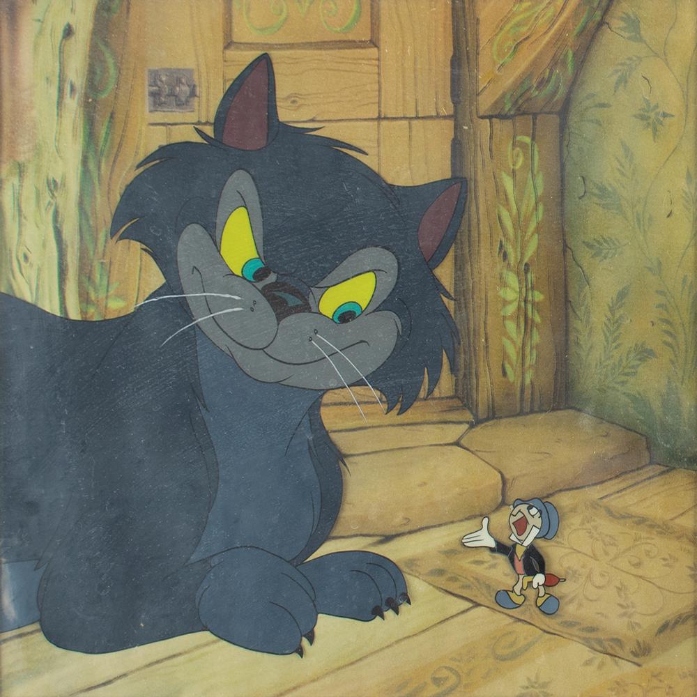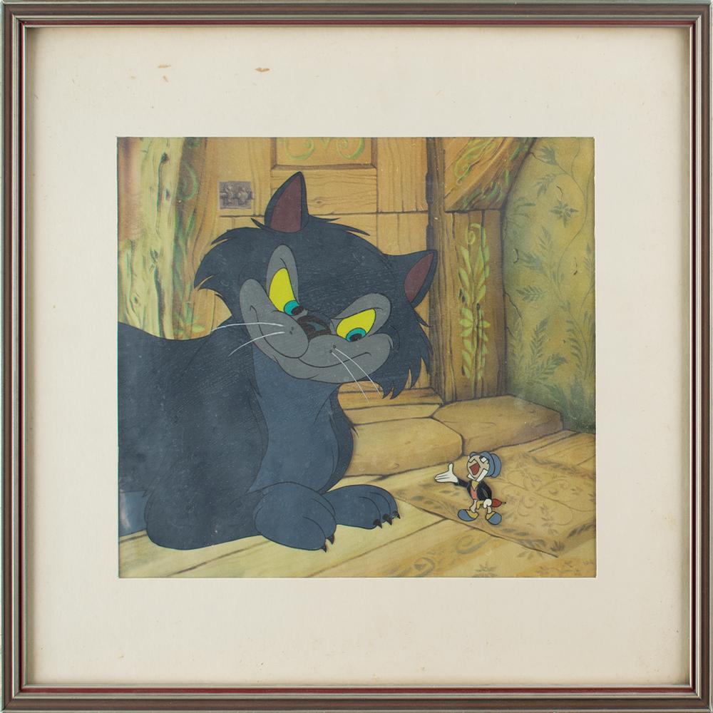 (Walt Disney Studios, 1955) Original production cel of Jiminy Cricket and Lucifer from a cartoon featured on Walt Disney's Disneyland, which shows the large black cat from Cinderella staring down the helpful cricket from Pinocchio. The cel is placed on a matching color copy background. Character images measure 6.5 x 6.75 (Lucifer) and 1.5 x 1.25 (Jiminy), with a mat opening of 10 x 8. Framed with the original mat to an overall size of 14.75 x 12.75. Reverse of frame bears the original souvenir sheet, which reads: "You now have in your possession a hand-inked and painted cartoon drawing which was used in one of Walt Disney's pictures." In fine condition, with some light toning to mat.
