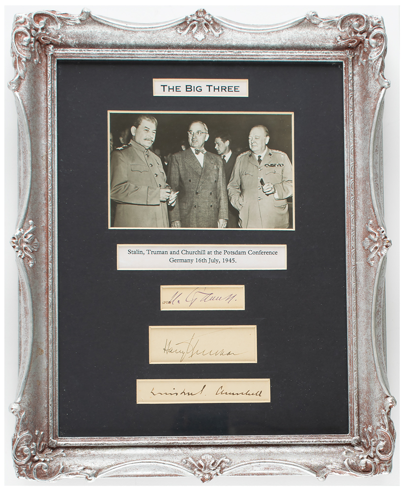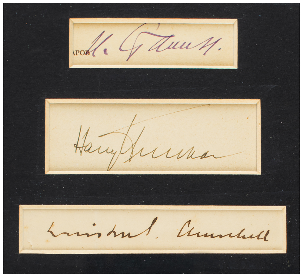 Significant assemblage of ink signatures from the Grand Alliance leaders of late World War II—Harry S. Truman, Winston Churchill, and Joseph Stalin—penned on individual off-white slips ranging in size from 2.25 x .5 to 3.5 x .5. Matted together with a photo of the three men at the 1945 Potsdam Conference and framed to an overall size of 10.25 x 12.75. In overall fine condition.