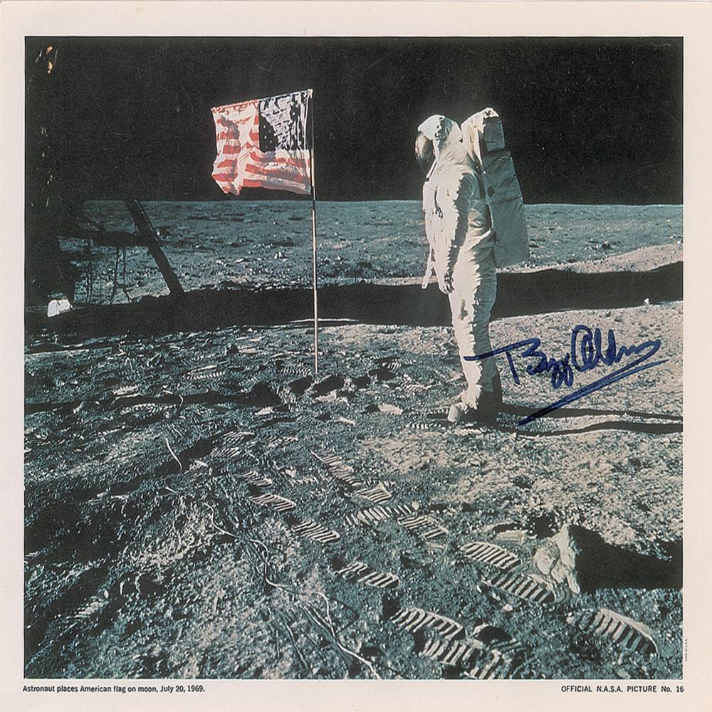 Official color 10 x 8 lightweight NASA lithograph of Buzz Aldrin standing next to the flag on the lunar surface during the Apollo 11 mission, signed in black felt tip. Caption to lower right corner: "Official N.A.S.A. Picture No. 16." In fine condition, with scattered light creasing.