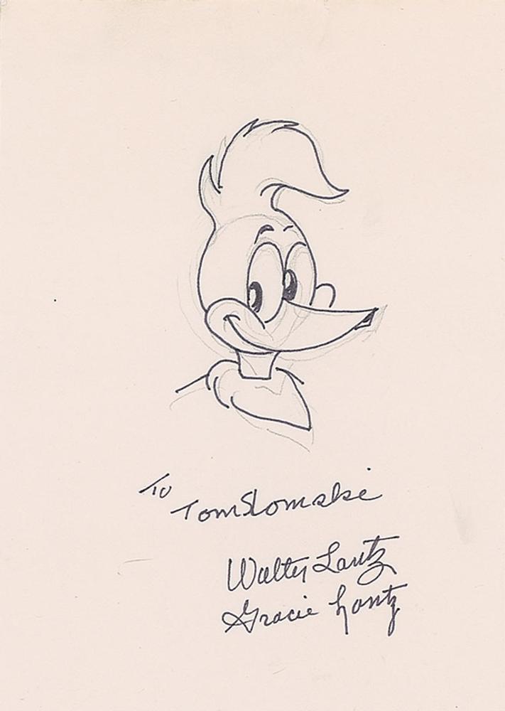 Original signed sketch of a smiling Woody Woodpecker, accomplished by Walter Lantz in pencil and ink on an off-white 5 x 7 sheet, signed and inscribed below, "To Tom Slomski, Walter Lantz." The sketch is also signed by his wife, Grace Lantz, who for four decades provided the voice of Woody Woodpecker. In fine condition.