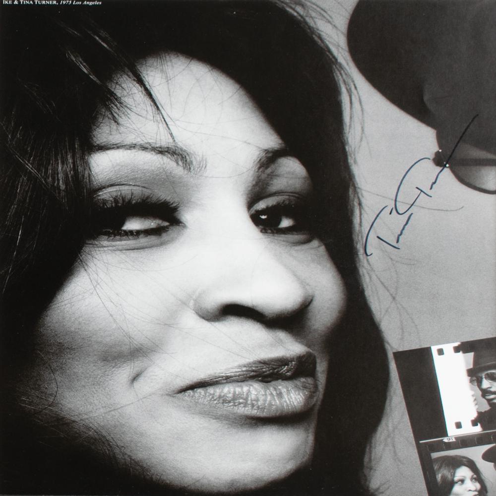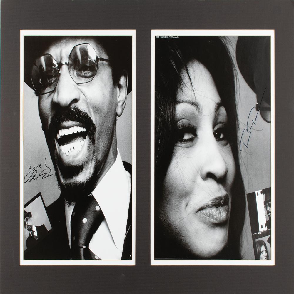 Book photos of Ike and Tina Turner, both approximately 10.5 x 13.75, showing the couple as they were photographed by Norman Seeff in 1975 Los Angeles, individually signed in black felt tip, "Love, Ike Turner" and "Tina Turner." Both are double-matted together to an overall size of 27 x 18. In overall fine condition.