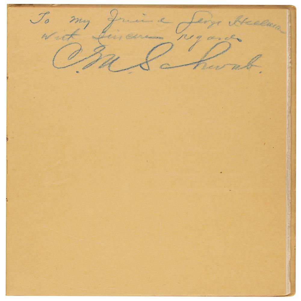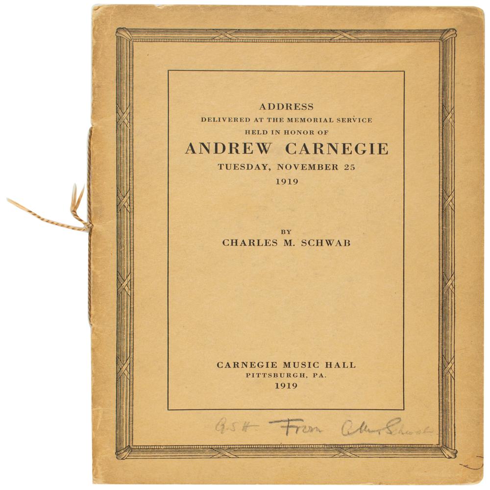 Booklet containing Schwab's "Address delivered at the memorial service held in honor of Andrew Carnegie" on November 25, 1919, 17 pages, 6.5 x 9.5, signed and inscribed on the first free end page in blue pencil, "To my friend George Steelman, with sincere regards, C. M. Schwab." In fine condition, with light soiling to the covers.