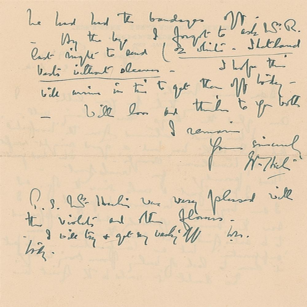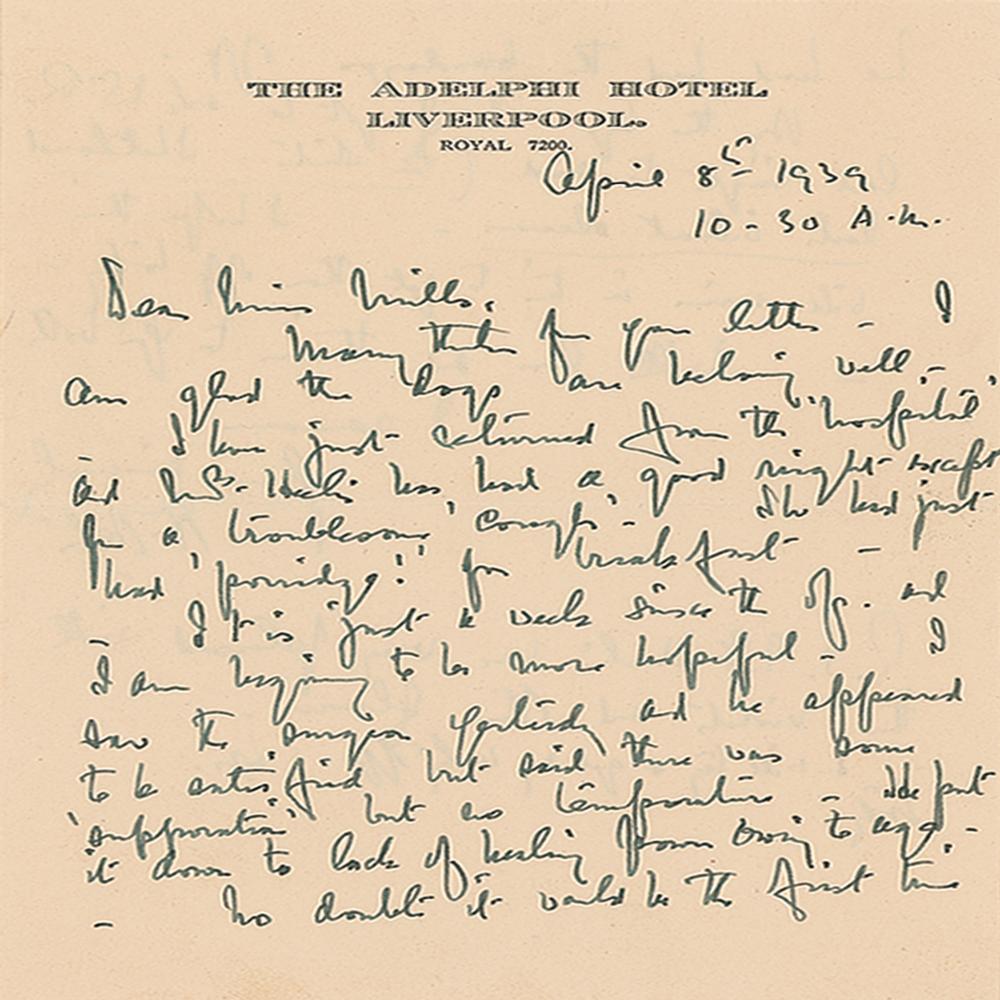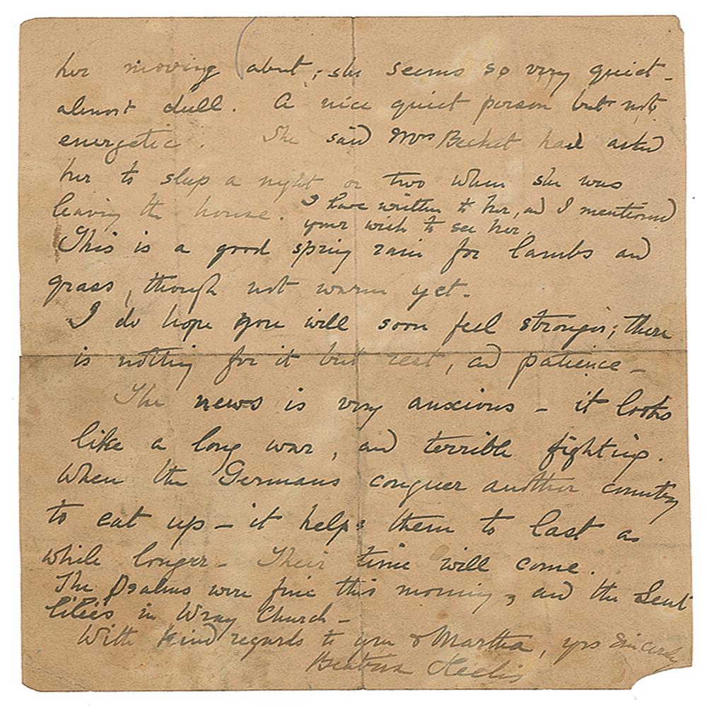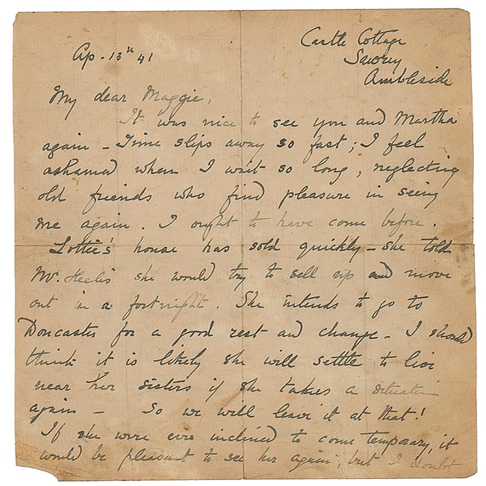 ALS signed “Beatrix Heelis,” one page both sides, 6 x 8, April 13, 1941. Letter written from Castle Cottage, Sawrey, in part: "Time slips away so fast, I feel ashamed when I wait so long, neglecting old friends who find pleasure in seeing me again. I ought to have come before. Lottie's house has sold quickly—she told Mr. Heelis she would try to sell up and move out in a fortnight. She intends to go to Doncaster for a good rest and change. I should think it is likely she will settle to live near her sisters if she takes a situation again…This is a good spring rain for lambs and grass, though not warm yet. I do hope you will soon feel stronger; there is nothing for it but rest, and patience—The news is very anxious—it looks like a long war, and terrible fighting. When the Germans conquer another country to eat up—it helps them to last a while longer—Their time will come." In very good condition, with overall staining, splitting to the ends of the intersecting folds, and a small bit of corner loss. Accompanied by a letter to a Miss Mills from Potter's husband, William Heelis, dated April 8, 1939 just after returning from the hospital following Beatrix Potter's hysterectomy operation. He reported that his wife "had a good night except for a troublesome 'cough.' She just had porridge for breakfast."
