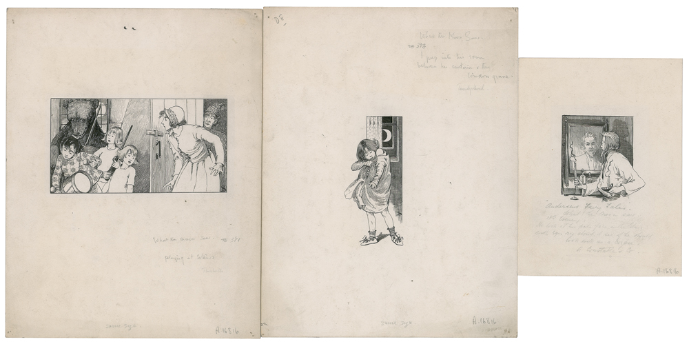 The third drawing, numbered 373, shows a young girl undressing and preparing for bed, with a crescent moon visible through a part in the window curtain—"I peep into the room, between the curtain and the window frame." In overall very good to fine condition, with light overall soiling, and tack holes to the corners. The three illustrations were published in the 1899 first edition of The Fairy Tales of Hans Christian Andersen, which was published by George Newnes by arrangement of Archibald Constable & Co.