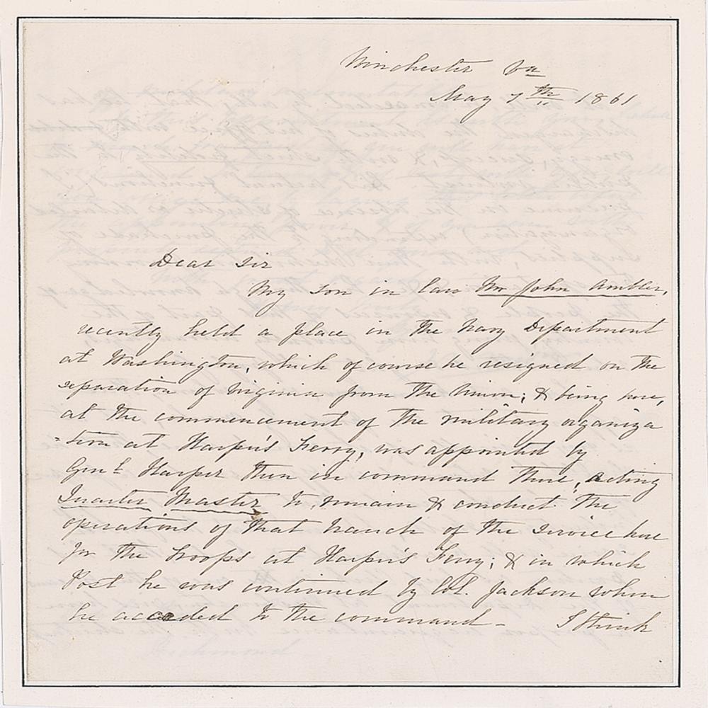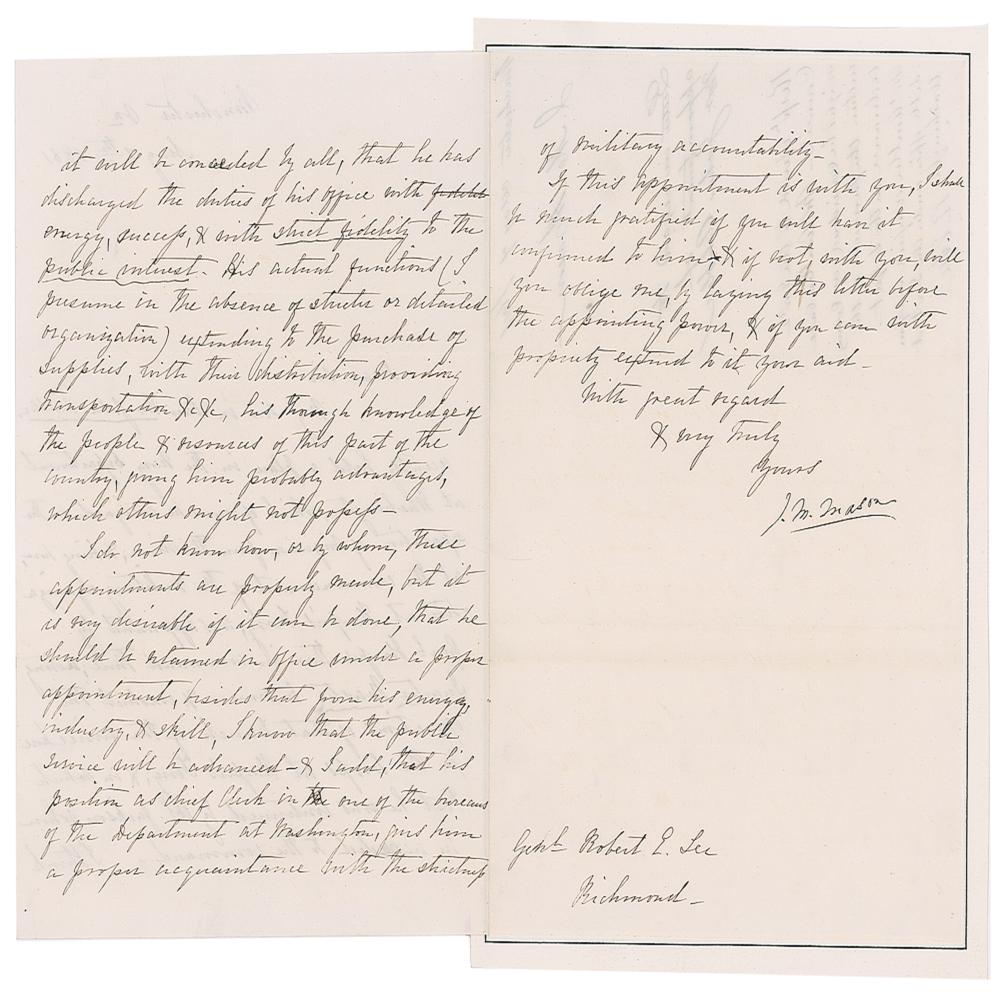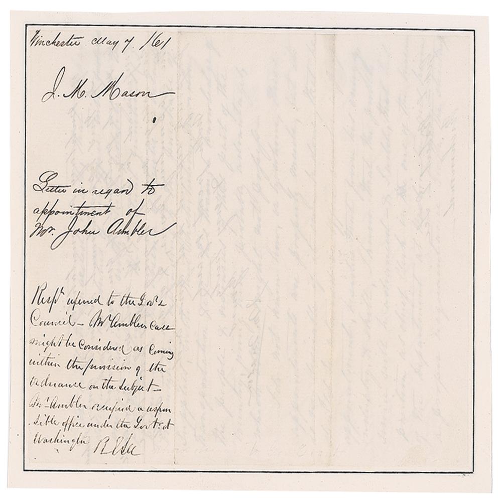 Mason's letter requests an appointment for his son-in-law, in part: "My son in law Mr. John Ambler, recently held a place in the Navy Department at Washington, which of course he resigned on the separation of Virginia from the Union, & being here, at the commencement of military organization at Harper's Ferry, was appointed by Gen'l Harper then in command there, acting Quarter Master to remain & construct the operations of that branch of the service?It will be conceded by all, that he has discharged the duties of his office with energy, success, & with strict fidelity to the public interest. His actual functions?extending to the purchase of supplies, with their distribution, providing transportation &c &c, his thorough knowledge of the people & resources of this part of the country, giving him probably advantages, which others might not possess. I do not know how, or by whom, these appointments are properly made, but it is very desirable if it can be done, that he should be retained in office under a proper appointment." Professionally inlaid into a slightly larger sheet and in fine condition.