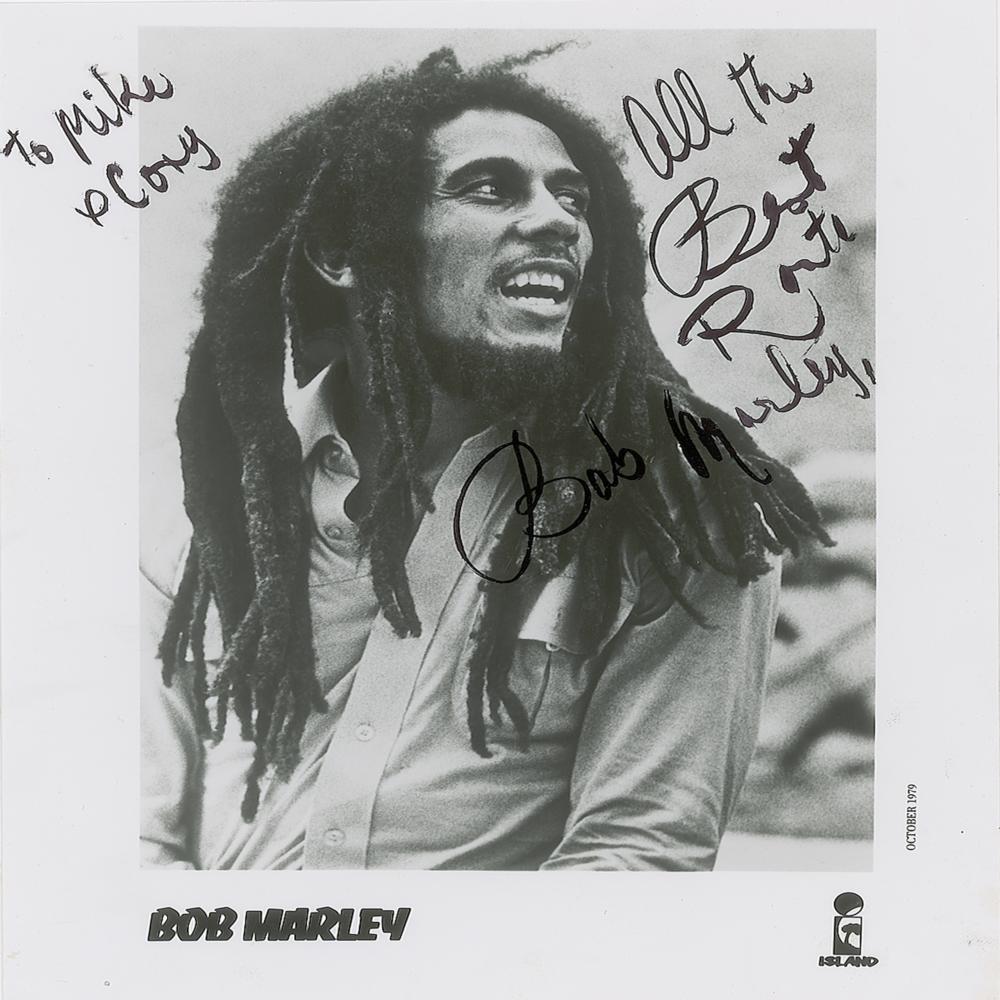Highly sought-after glossy 8 x 10 Island Records publicity photo of Bob Marley circa 1979, signed and inscribed in black felt tip, "To Mike & Cory, All the best, Rasta, Bob Marley.” In fine condition. A hugely desirable autographed photo of the reggae music icon.