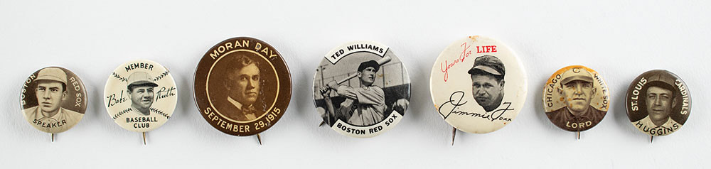 Group of seven pinback buttons depicting early baseball greats, including: 1910-12 Sweet Caporal P2 pins of Tris Speaker, Miller Huggins, and Harry Lord; a 1915 'Moran Day' pin honoring Pat Moran; a 1930s 'Yours for Life' Jimmie Foxx pin; a 1934 "Babe Ruth Baseball Club" member pin; and a 1950s PM10 Ted Williams pin. In overall very good to fine condition. From the collection of Stephen Adamson.