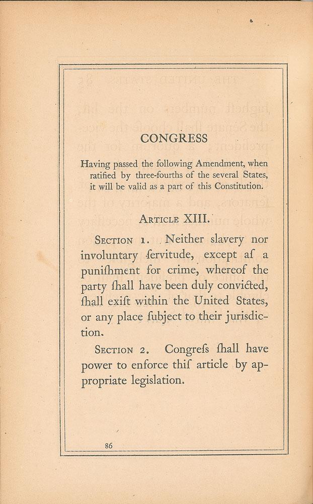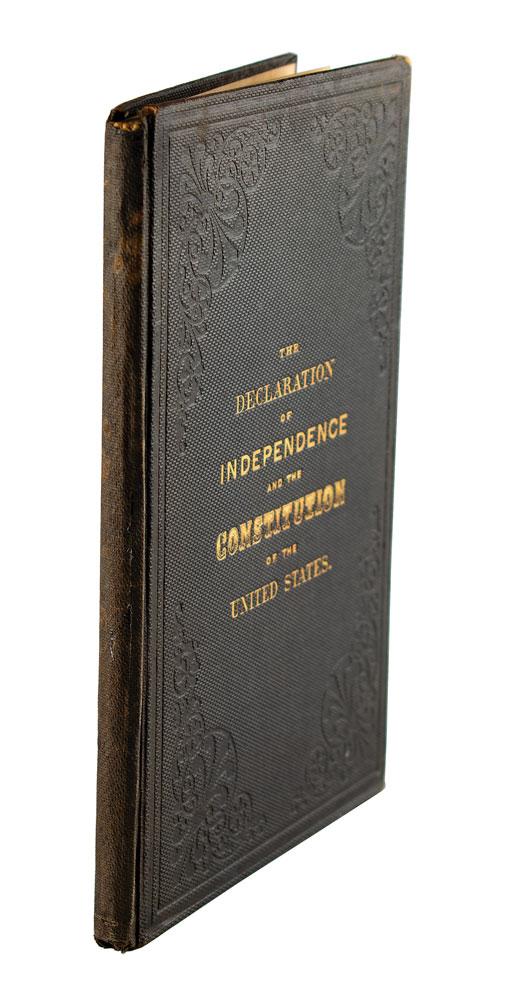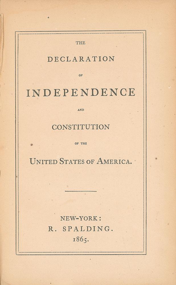 Civil War-era unsigned book: The Declaration of Independence and the Constitution of the United States. First edition. NY: R. Spalding, 1865. Hardcover, 5.75 x 8.75, 86 pages. The last page features the text of the 13th Amendment abolishing slavery, its first appearance in book-print form. Book condition: VG/None, with rubbing to spine and corners, small losses at spine ends, and minor dampstaining to endpapers.