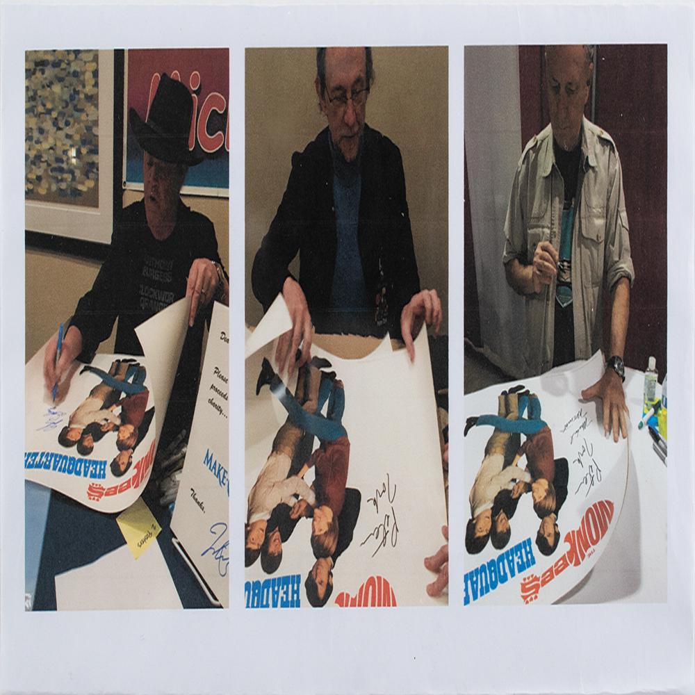 Color 28 x 22 Rhino Records print of the Monkees, signed in blue and black felt tip by Peter Tork, Michael Nesmith, and Mickey Dolenz. In fine condition. Accompanied by images taken at the time of signing.