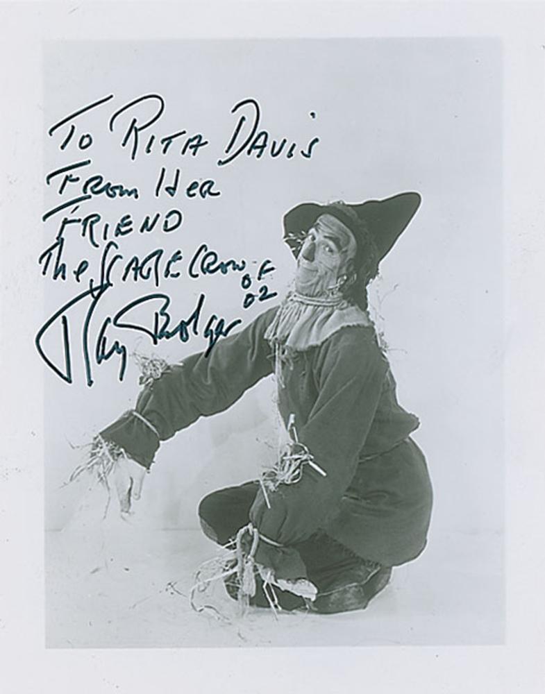 Two signed photos: a glossy 4 x 5 photo of Bolger in costume as the Scarecrow, signed and inscribed in black felt tip, "To Rita Davis, From Her Friend the Scarecrow of Oz, Ray Bolger"; and a glossy 10 x 8 photo of the four Wizard of Oz friends, signed and inscribed in black felt tip, "To George, From The 'Tin Man,' Jack Haley." In fine condition.