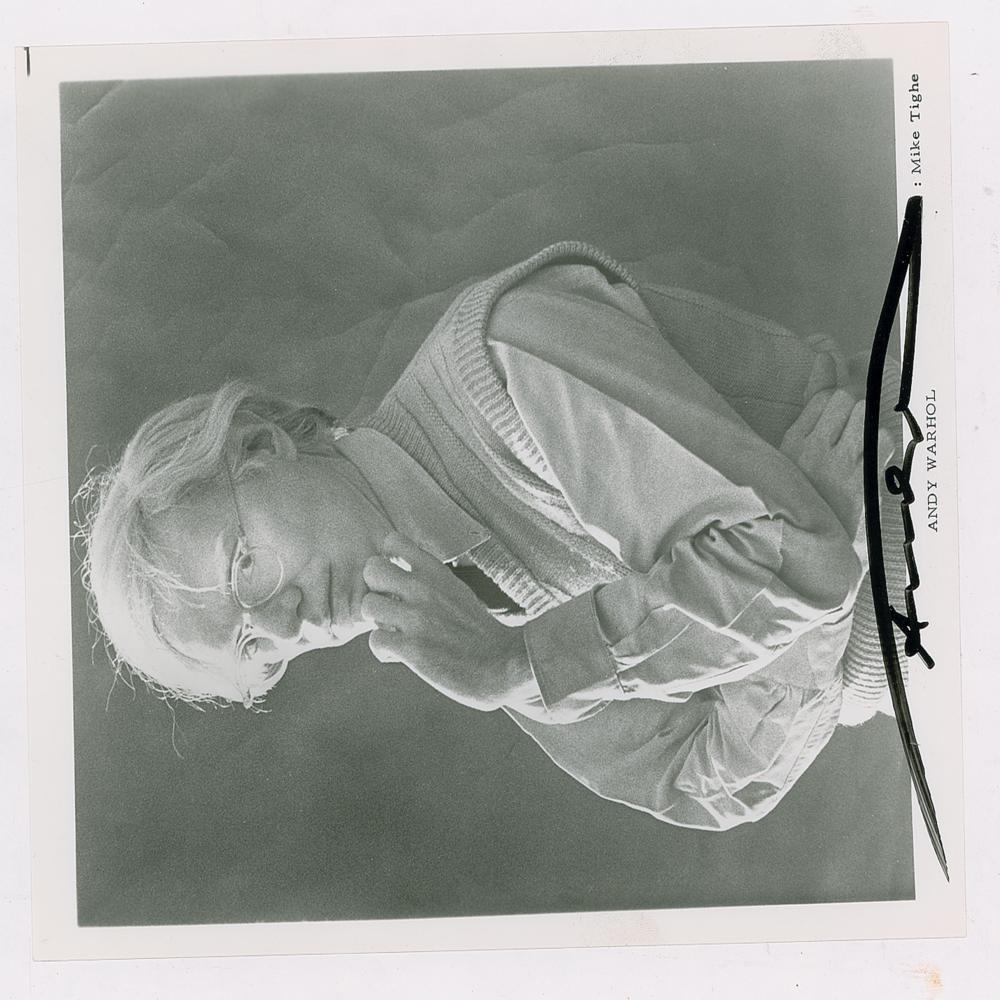 Choice glossy 8 x 10 photo of Warhol with his chin on his hand by Mike Tighe, boldly signed across the bottom in thick black felt tip. In very fine condition.