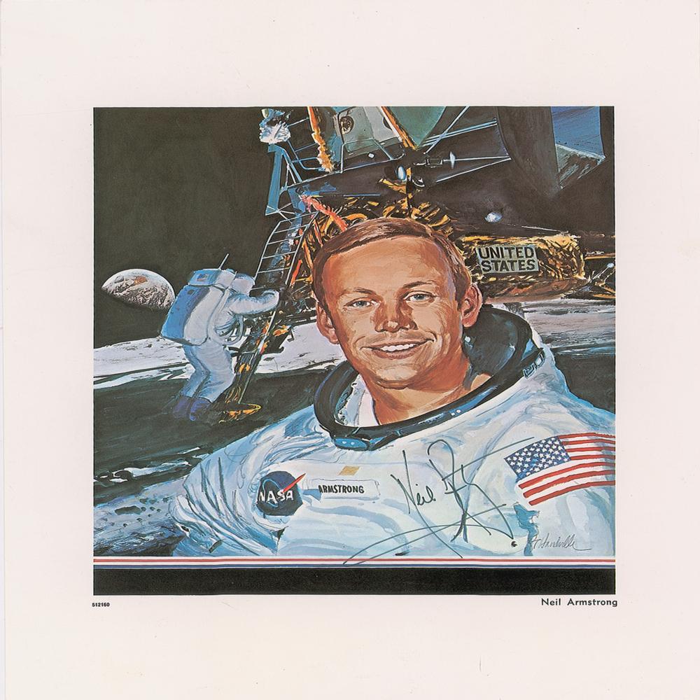 Color 10 x 13 print featuring an artistic portrait of Neil Armstrong, signed in black felt tip. In very fine condition. A highly desirable uninscribed example with an appealing image.