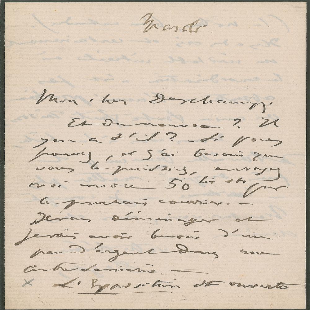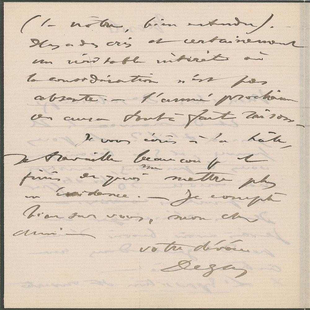 ALS in French, signed “Degas,” one page both sides, 4.25 x 6.75, no date but circa April 1874. Letter to art dealer Charles Deschamps, referencing the famed first Impressionist exhibition of 1874. In part (translated): "The exhibition has opened (ours, of course). There have been many shouts but it has also awakened a real interest where you can perceive an amount of respect. Next year everyone will agree we are right. I write in great haste as I am working very hard in order to produce enough for my work to stand out." In fine condition.