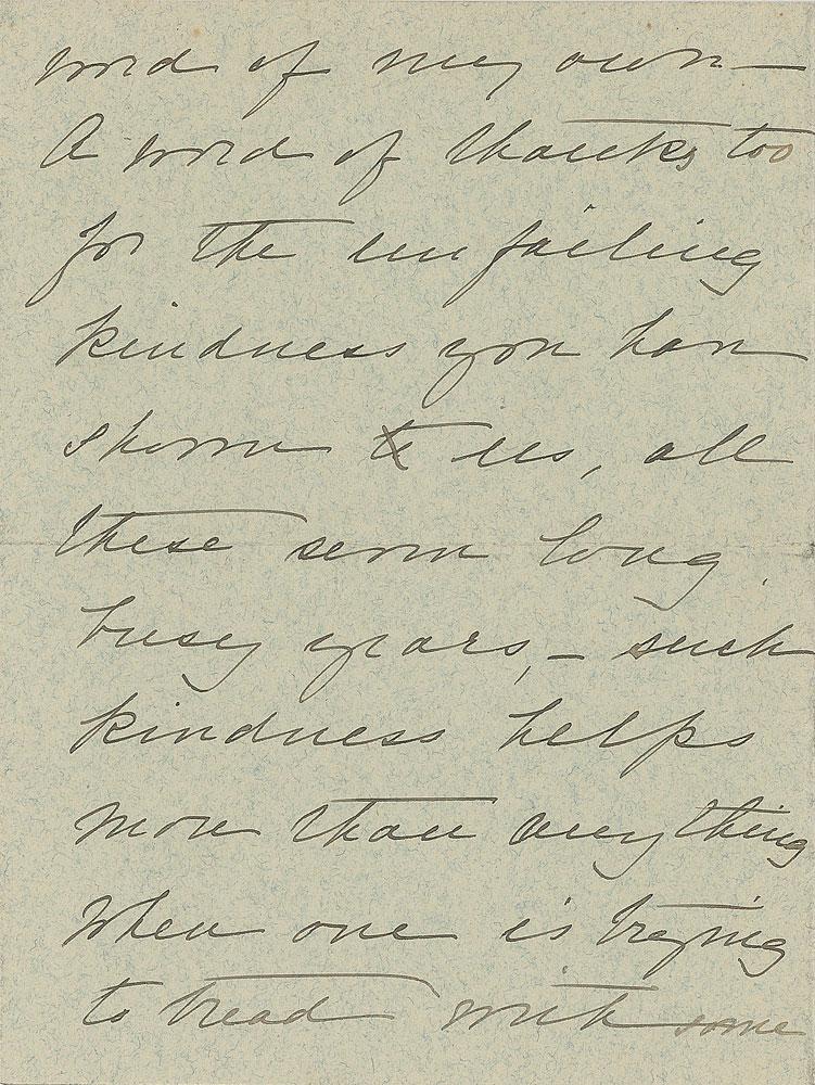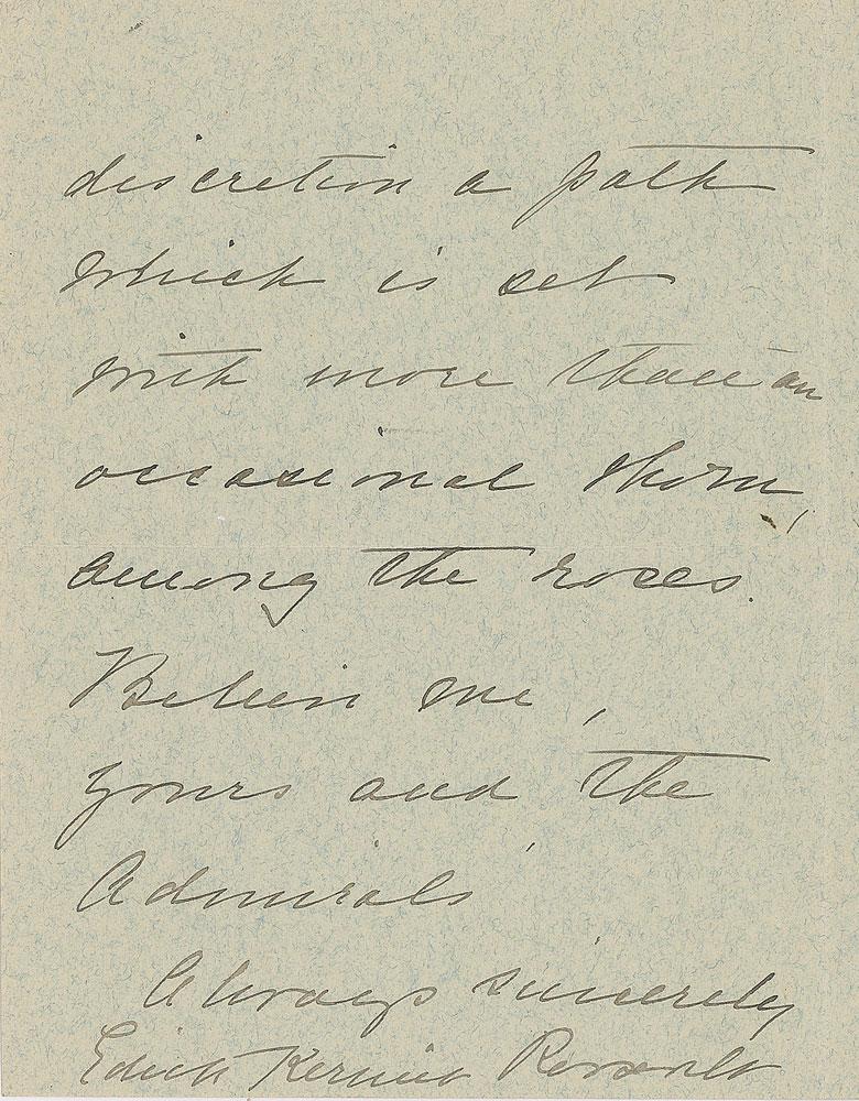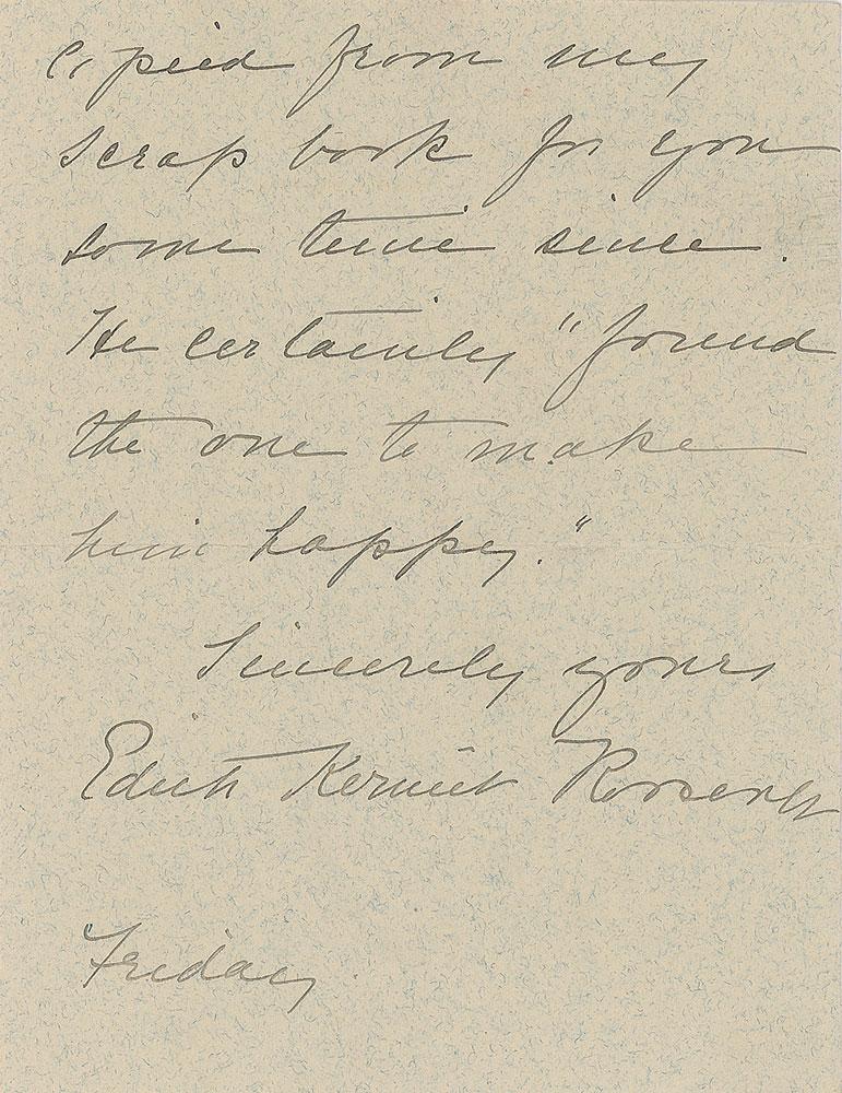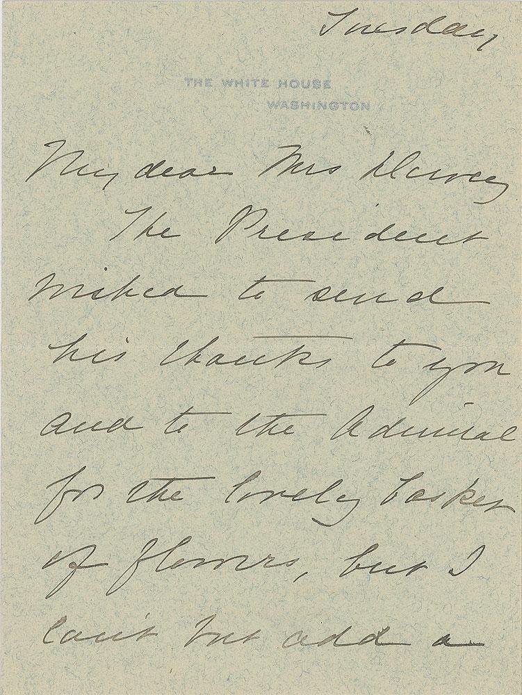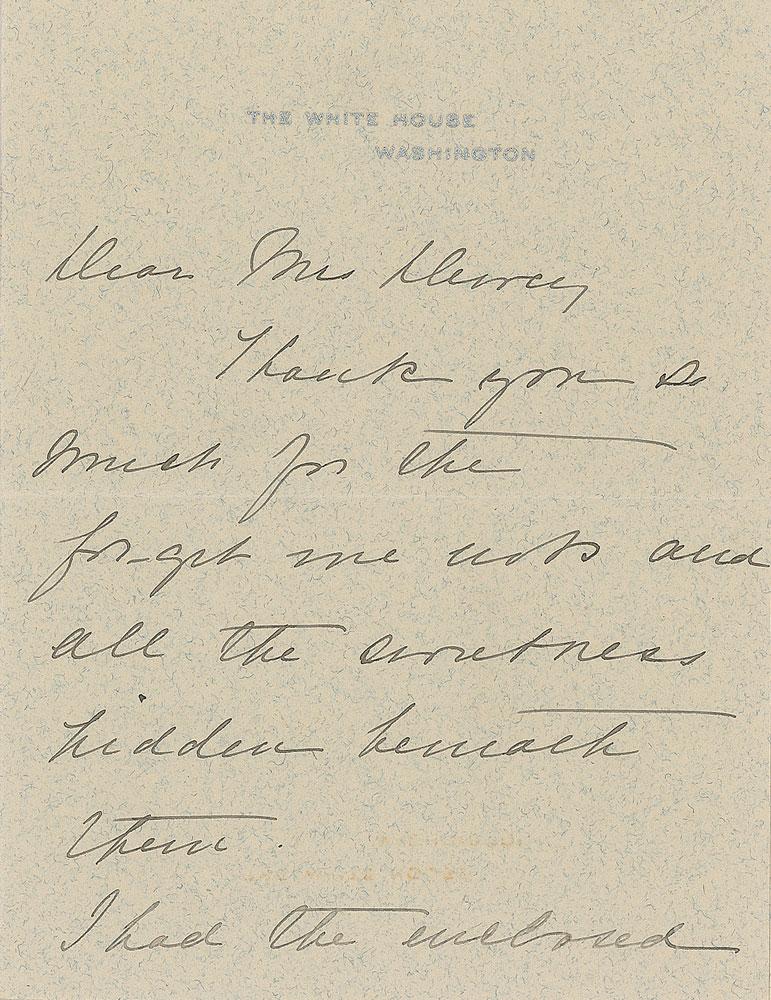 Two ALSs signed as first lady, “Edith Kermit Roosevelt," totaling five pages on adjoining sheets of White House letterhead, 4.25 x 5.75, both to Mildred McLean Dewey, the wife of Admiral George Dewey. One thanks Mrs. Dewey for the "forget-me-nots" and in return she sends something (likely about Admiral Dewey) "copied from my scrap for you some time since. He certainly 'found the one to make him happy.'" The other, likely written when Roosevelt was about to leave office, in full: "My Dear Mrs. Dewey—The President wished to send his thanks to you and to the Admiral for the lovely basket of flowers, but I can't but add a few words of my own. A word of thanks too for the unfailing kindness you have shown to us, all these seven long busy years,—such kindness helps more than anything when one is trying to tread with some discretion a path which is set with more than an occasional thorn among the roses." In fine condition. Accompanied by one of the original transmittal envelopes.