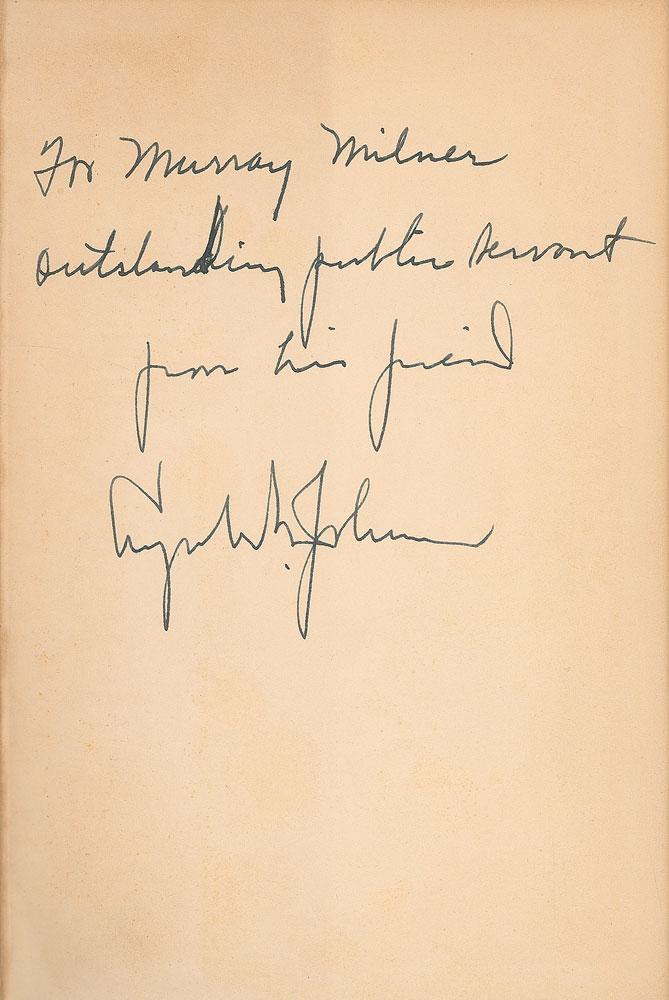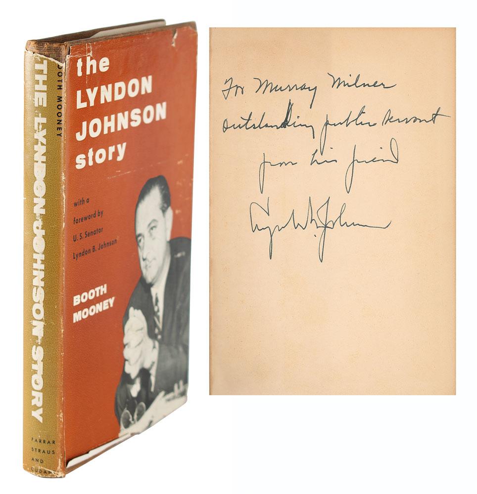 Signed book: The Lyndon Johnson Story. First edition. NY: Farar, Straus and Cudahy, 1956. Hardcover with dust jacket, 5.75 x 8.5, 178 pages. Signed and inscribed on the first free end page in fountain pen, "For Murray Milner, outstanding public servant, from his friend, Lyndon B. Johnson." In very good condition, with light toning to the signed page, staining to the hinges and pastedowns, and chipping, sunning, and tears to the dust jacket (some repaired with old toned tape).