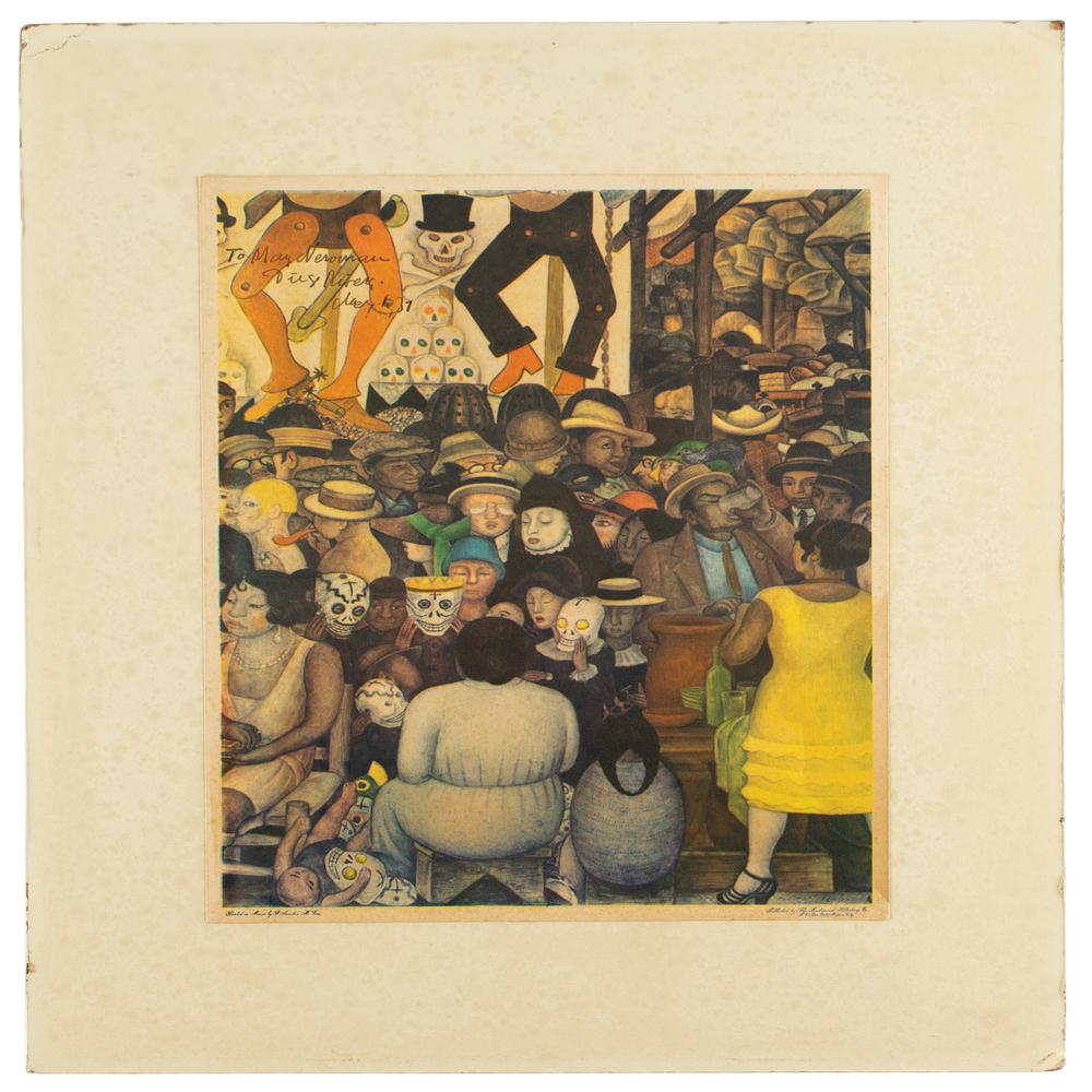 Highly regarded and influential Mexican artist (1886-1957) who earned international acclaim-and stirred up much controversy-for his powerful, politically charged murals. Vintage color 9 x 12 print of a detail from Rivera's 1924 fresco mural ‘The Day of the Dead,’ which is featured at the Secretariat of Public Education Main Headquarters in Mexico City, signed and inscribed in the upper left in fountain pen, "To May Newman, Diego Rivera, May 1, 37." Affixed to an off-white 14 x 16.75 cardstock mount. In very good to fine condition, with spotty staining and corner creases to the mount, and a subtle, unobtrusive stain to the lower right right edge of the print, extending into yellow dress of figure.
