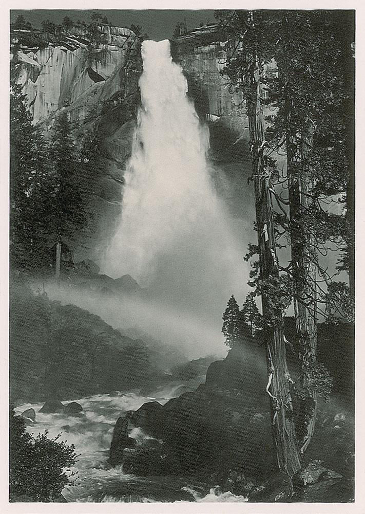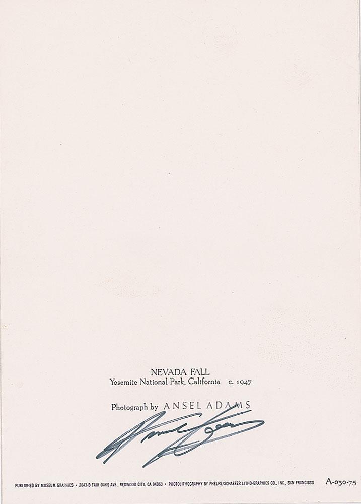 Attractive glossy greeting card with the front featuring an Ansel Adams photograph of Yosemite's Nevada Fall, measuring 5 x 7 closed, signed on the reverse in black felt tip. In fine condition.