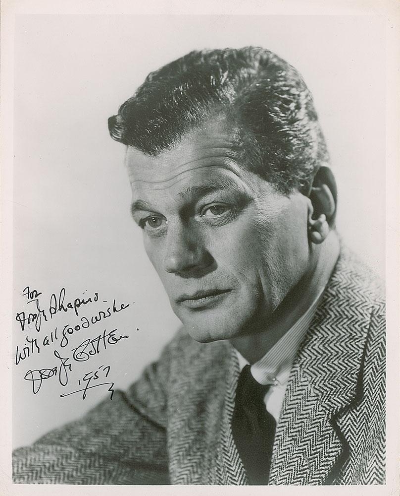 Vintage matte-finish 8 x 10 close-up photo of the Citizen Kane actor, signed and inscribed in fountain pen, "For Joseph Shapiro, with all good wishes, Joseph Cotten, 1957.” In fine condition.