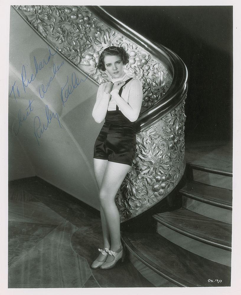 Glossy 8 x 10 full-length photo of Keeler posing next to an ornate staircase, signed and inscribed in black ballpoint, "To Richard, best wishes, Ruby Keeler.” In fine condition.