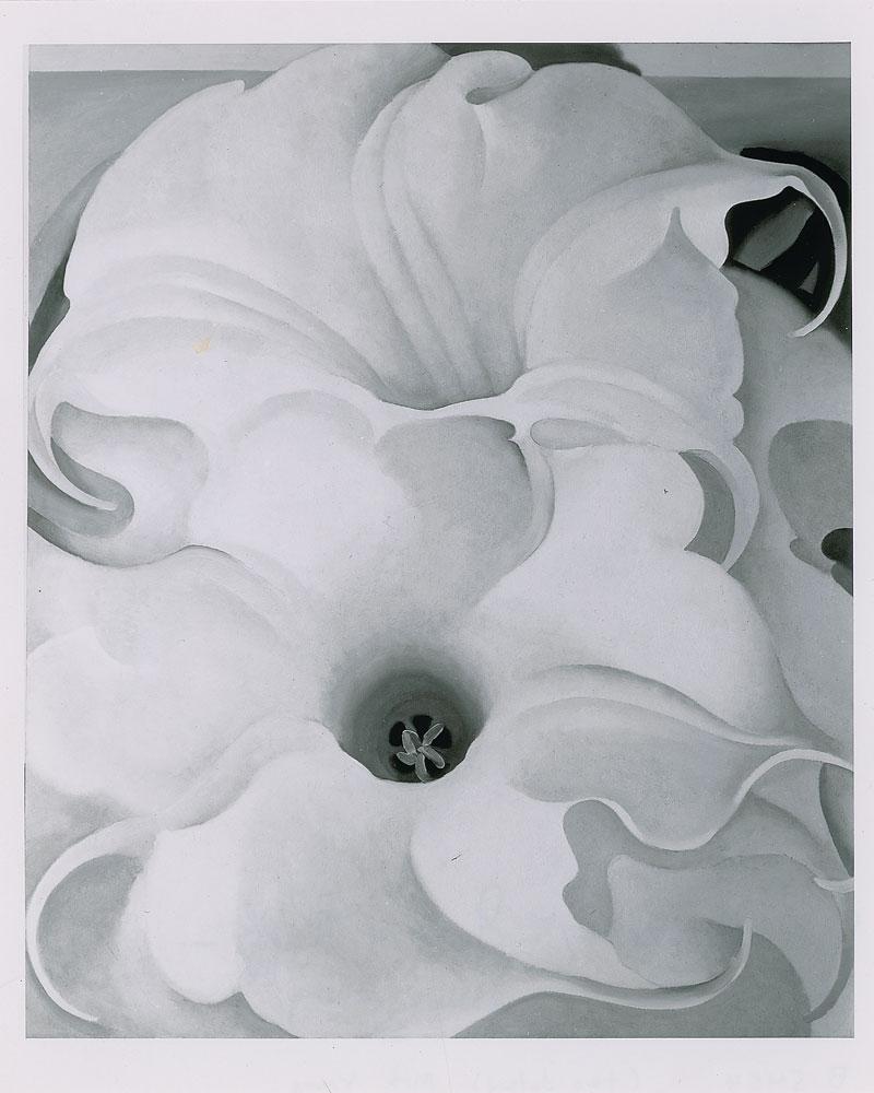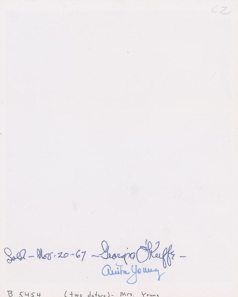 Glossy 8 x 10 photo of an O'Keeffe painting entitled 'To Datura,' signed on the reverse in black ballpoint, "Sold—Nov. 20-67—Georgia O'Keeffe." The photograph, which is also signed by her sister, Anita Young, was apparently taken as part of an inventory of O'Keeffe's works by her agent. In fine condition.