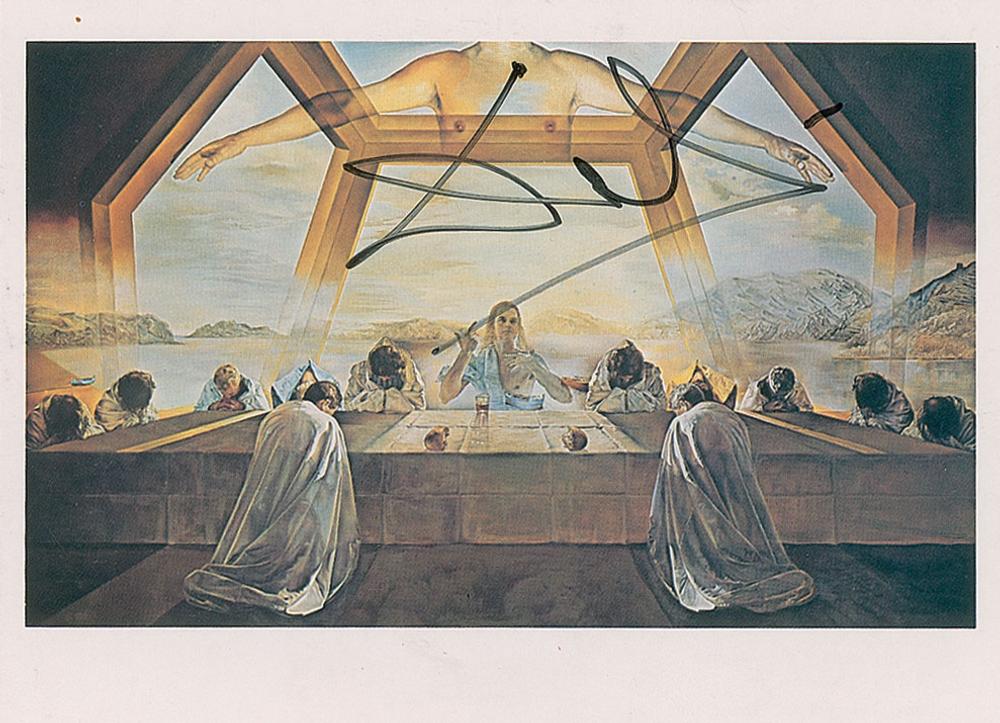 Attractive color semi-glossy 5.75 x 4.25 postcard of Salvador Dali's work entitled 'The Sacrament of the Last Supper,' signed in black felt tip, "Dali." In very fine condition.