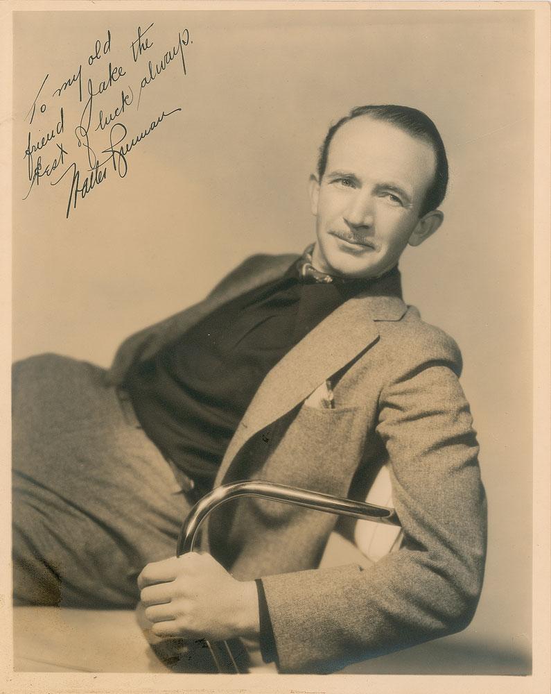 Vintage sepia matte-finish 8 x 10 photo of the three-time Oscar-winner in a relaxed pose, signed and inscribed in fountain pen, "To my old friend Jake, the best of luck always, Walter Brennan.” In fine condition.
